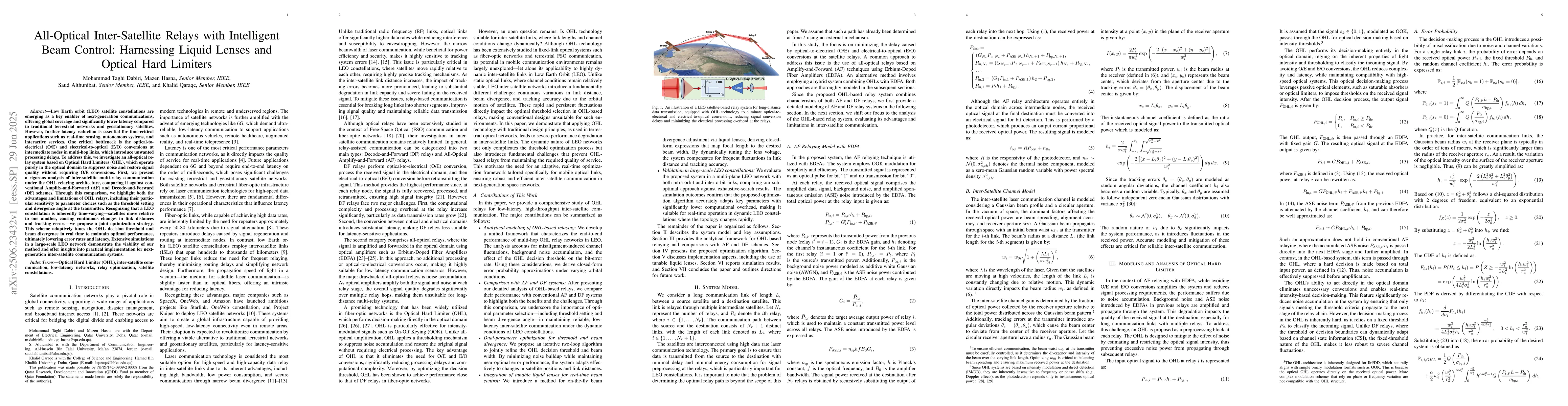 The paper presents a novel all-optical relay system using Optical Hard Limiters (OHL) for inter-satellite communications, combined with liquid lenses for real-time beamwidth control, offering a promising solution to reduce latency and complexity in satellite networks.
