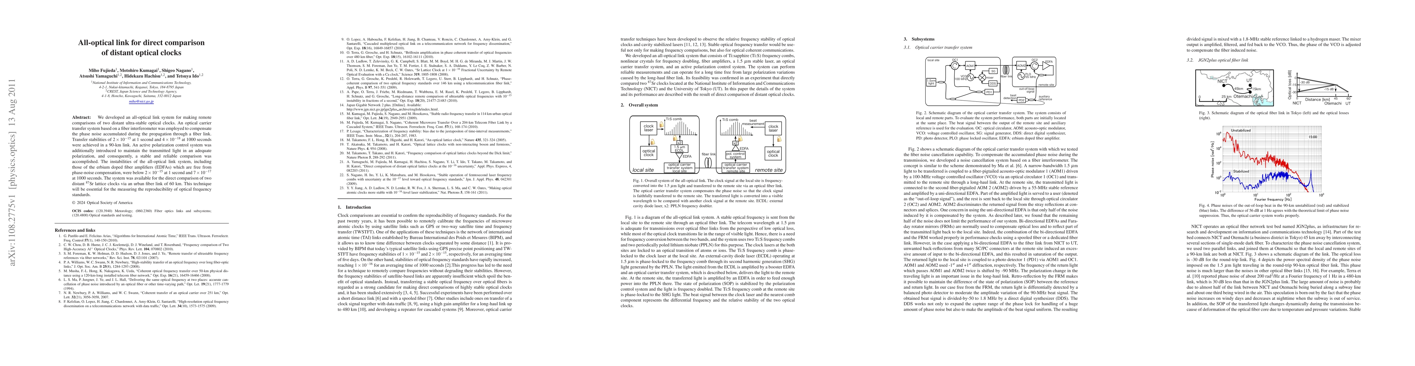 We developed an all-optical link system for making remote comparisons of two distant ultra-stable optical clocks. An optical carrier transfer system based on a fiber interferometer was employed to compensate the phase noise accumulated during the propagation through a fiber link. Transfer stabilities of $2\times10^{-15}$ at 1 second and $4\times10^{-18}$ at 1000 seconds were achieved in a 90-km link. An active polarization control system was additionally introduced to maintain the transmitted light in an adequate polarization, and consequently, a stable and reliable comparison was accomplished. The instabilities of the all-optical link system, including those of the erbium doped fiber amplifiers (EDFAs) which are free from phase-noise compensation, were below $2\times10^{-15}$ at 1 second and $7\times10^{-17}$ at 1000 seconds. The system was available for the direct comparison of two distant $^{87}$Sr lattice clocks via an urban fiber link of 60 km. This technique will be essential for the measuring the reproducibility of optical frequency standards.