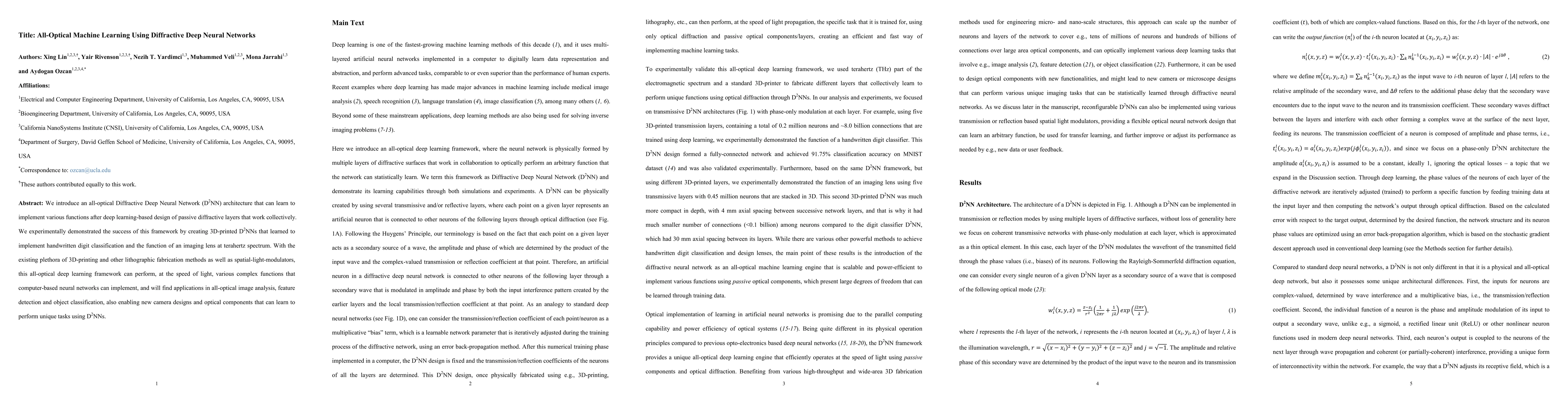This paper presents an all-optical Diffractive Deep Neural Network (D2NN) architecture capable of learning and implementing various functions through passive diffractive layers. Experimentally demonstrated with 3D-printed D2NNs, it shows potential for applications in all-optical image analysis and camera design.