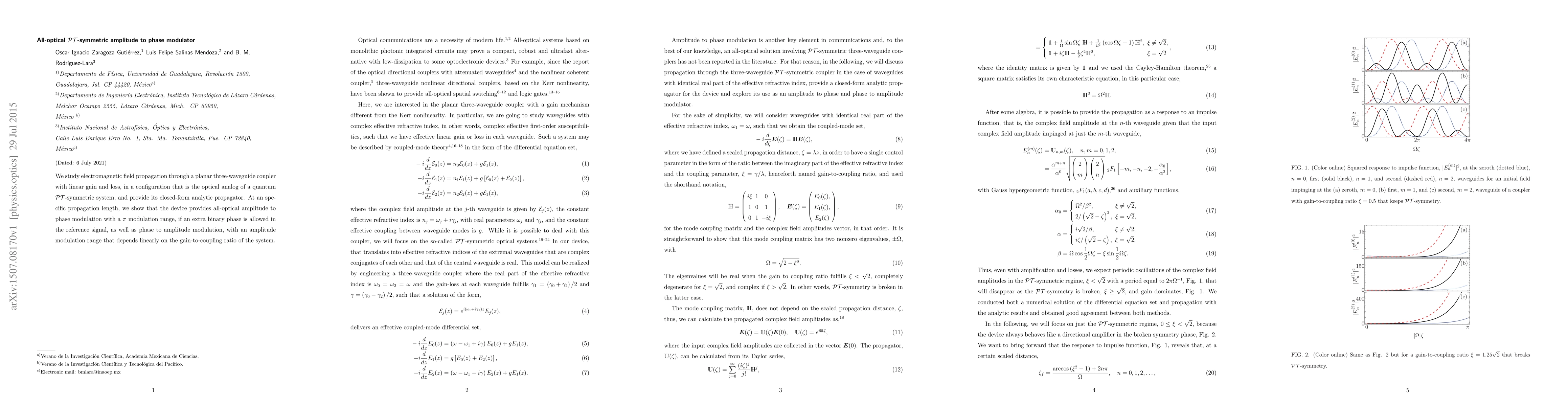 We study electromagnetic field propagation through a planar three-waveguide coupler with linear gain and loss, in a configuration that is the optical analog of a quantum $\mathcal{PT}$-symmetric system, and provide its closed-form analytic propagator. At an specific propagation length, we show that the device provides all-optical amplitude to phase modulation with a $\pi$ modulation range, if an extra binary phase is allowed in the reference signal, as well as phase to amplitude modulation, with an amplitude modulation range that depends linearly on the gain-to-coupling ratio of the system.