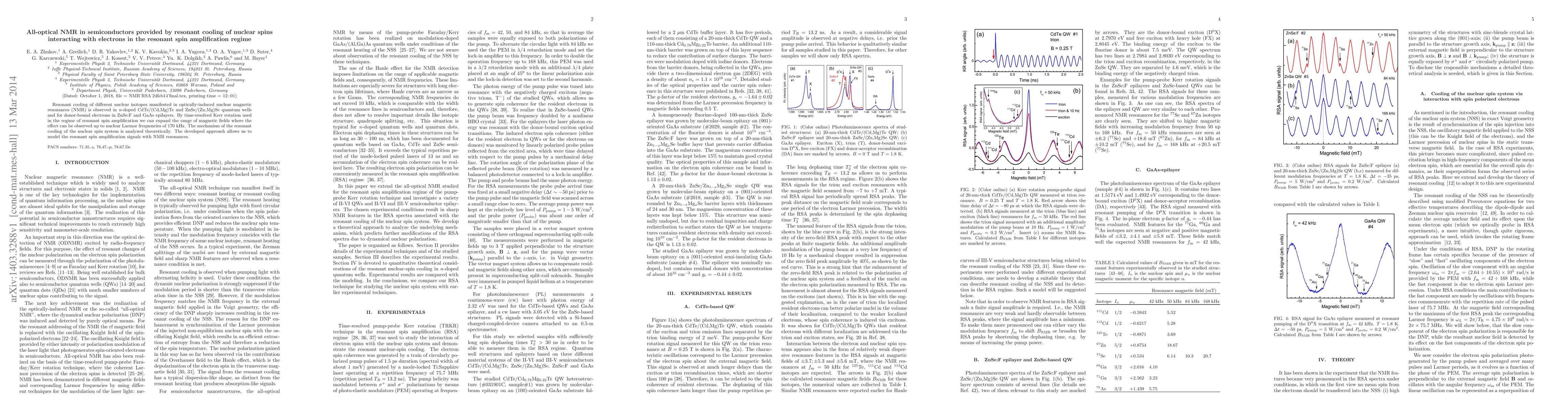 This paper reports on the observation of resonant cooling of nuclear spins in semiconductors via optically-induced nuclear magnetic resonance (NMR) in various materials. The study utilizes time-resolved Kerr rotation in the resonant spin amplification regime to extend the observable range of magnetic fields up to 170 kHz nuclear Larmor frequencies.