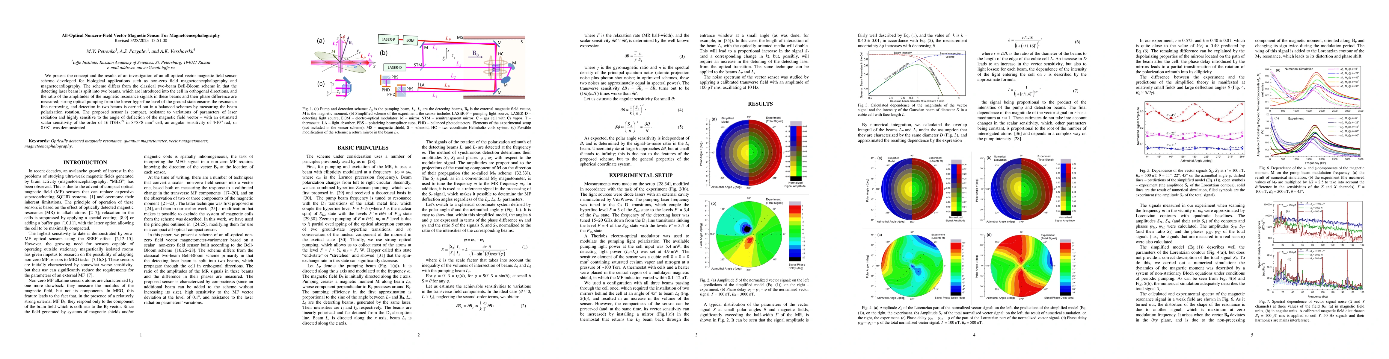 This paper introduces an all-optical vector magnetic field sensor for magnetoencephalography, differing from traditional methods by splitting the detecting laser beam into two orthogonal paths. The sensor demonstrates high sensitivity and compactness, with estimated scalar sensitivity of 16 fT/Hz1/2 and angular sensitivity of 4x10-7 rad.