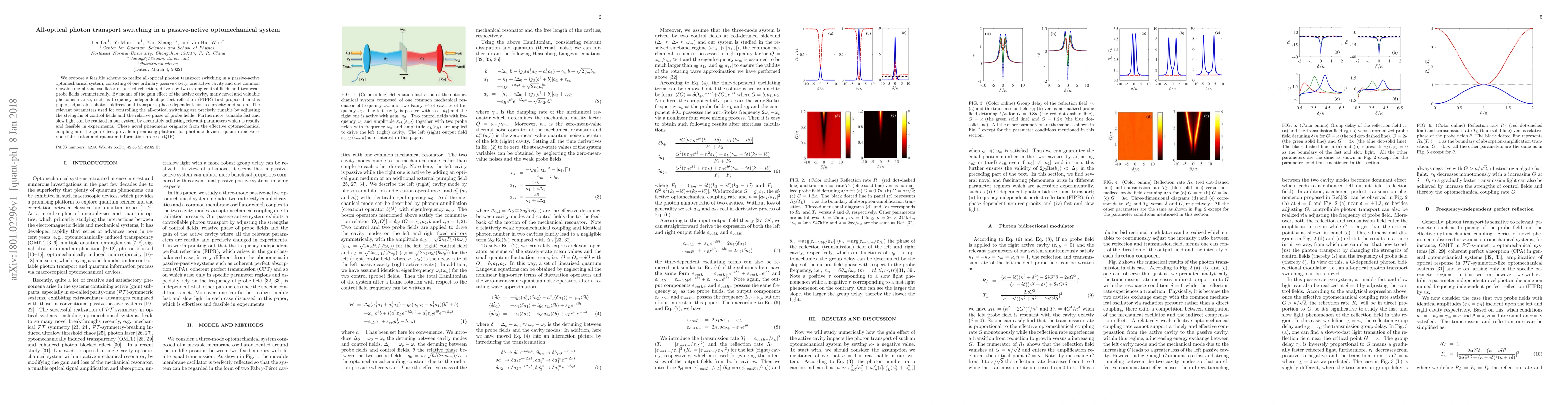 This paper proposes an all-optical photon transmission switching scheme in a passive-active optomechanical system, utilizing a movable membrane and control fields to achieve phenomena like frequency-independent perfect reflection and tunable fast/slow light, offering potential for photonic devices and quantum information processing.