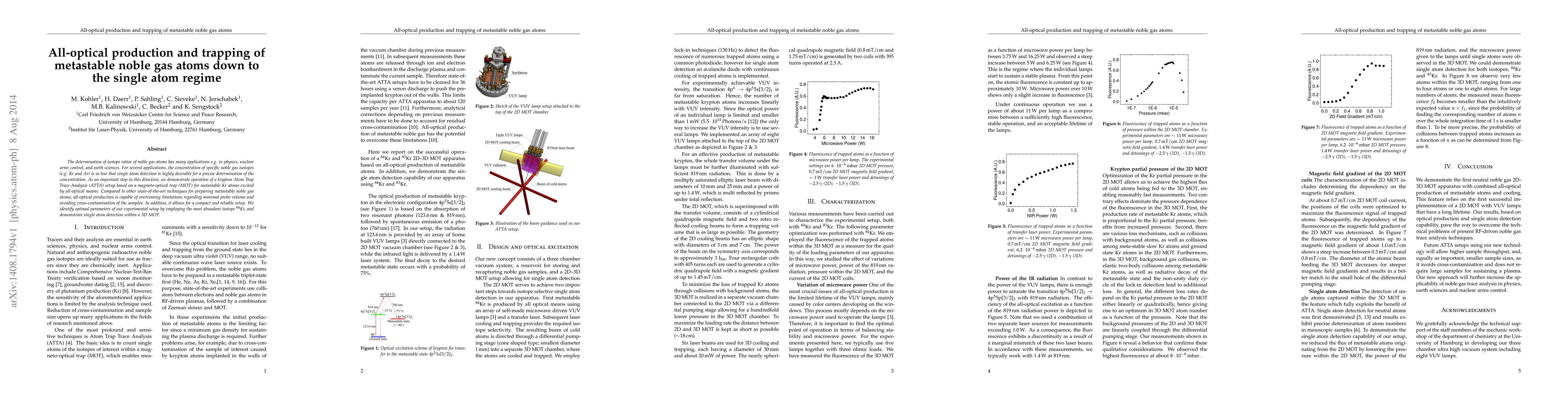 This paper details the development of an all-optical method for producing and trapping metastable noble gas atoms, specifically krypton, down to the single atom regime using a magneto-optical trap. The technique aims to enable precise isotope ratio determination in applications like nuclear arms control and earth sciences.