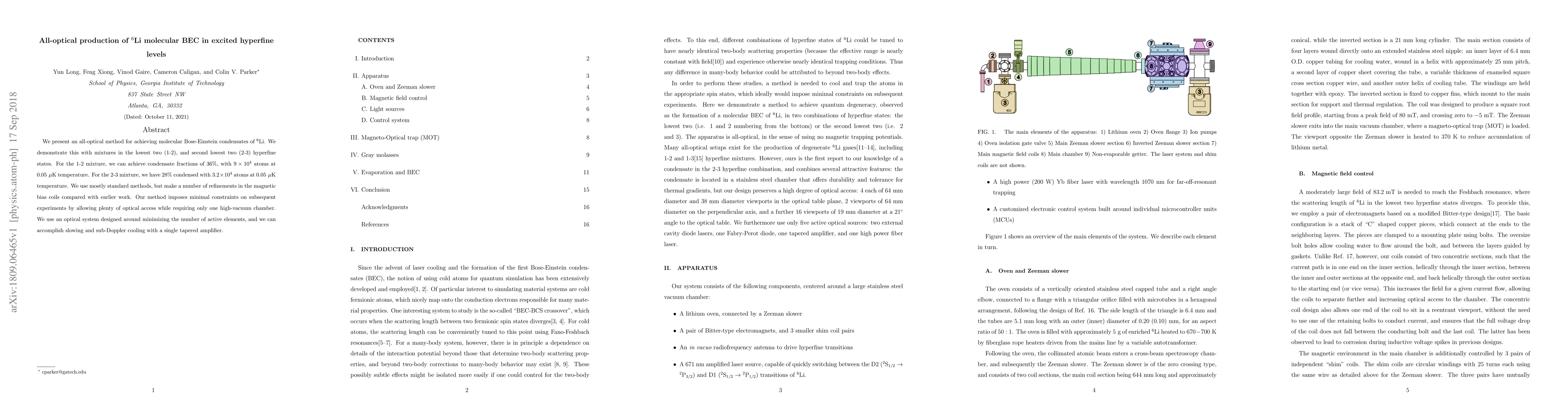 This research paper details an all-optical technique for producing molecular Bose-Einstein condensates (BECs) of ${}^6\textrm{Li}$ in excited hyperfine states, achieving condensate fractions of 36% for 1-2 mixtures and 28% for 2-3 mixtures at ultra-low temperatures. The method employs refined magnetic coils and minimal optical constraints.