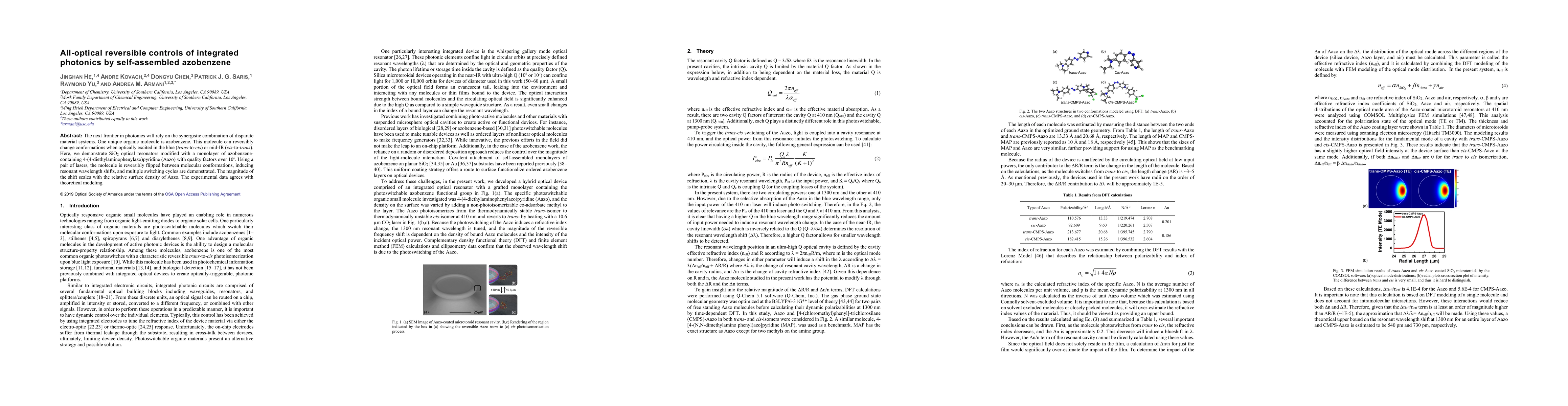 This paper demonstrates reversible optical control of integrated photonics using self-assembled azobenzene molecules on SiO2 optical resonators, achieving high-quality factors and wavelength shifts through reversible molecular conformation changes induced by laser excitation. The study shows multiple switching cycles and confirms the experimental results with theoretical modeling.