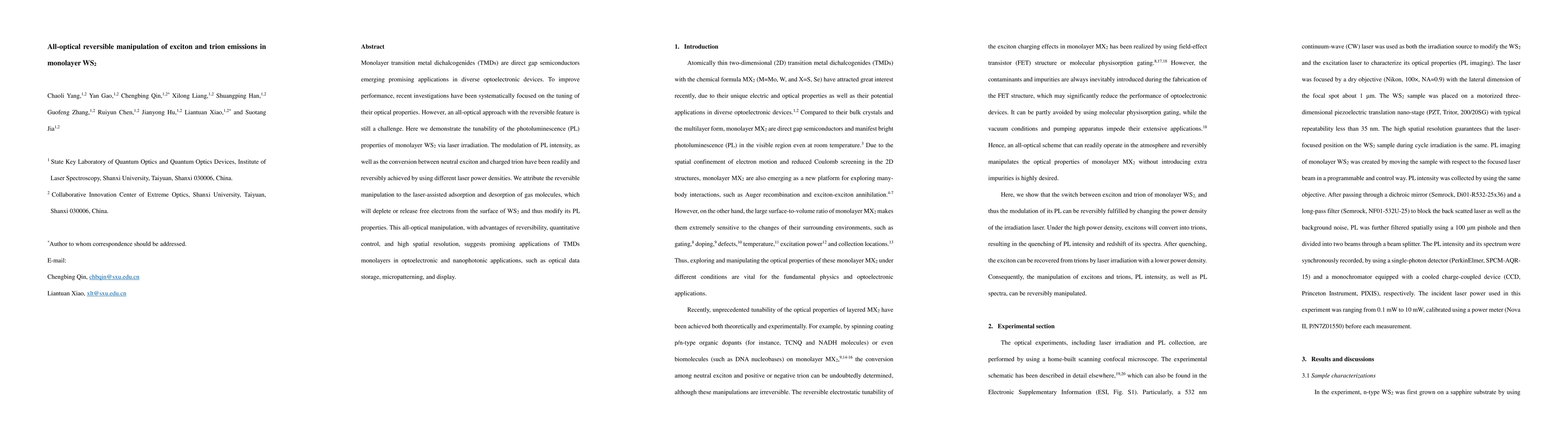This paper demonstrates all-optical reversible manipulation of exciton and trion emissions in monolayer WS2 using laser irradiation, enabling modulation of photoluminescence intensity and conversion between excitons and trions through laser-induced gas molecule adsorption/desorption, with potential applications in optoelectronics and nanophotonics.