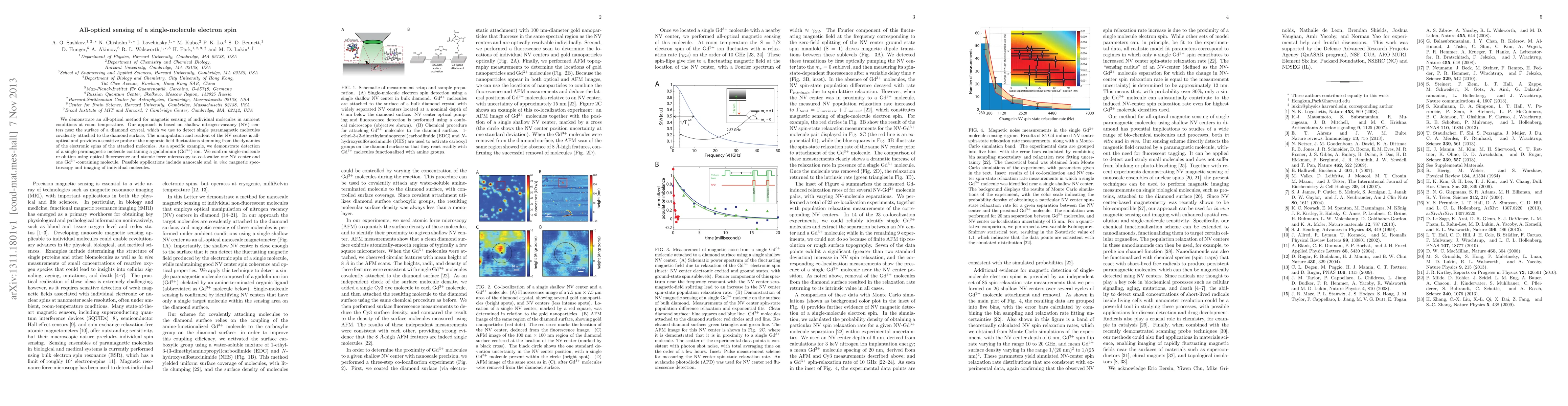 This paper presents an all-optical technique for detecting single-molecule electron spins using nitrogen-vacancy centers in diamond, achieving magnetic sensing at room temperature. The method successfully identifies a single paramagnetic molecule with a gadolinium ion, demonstrating potential for nanoscale and in vivo magnetic spectroscopy and imaging.