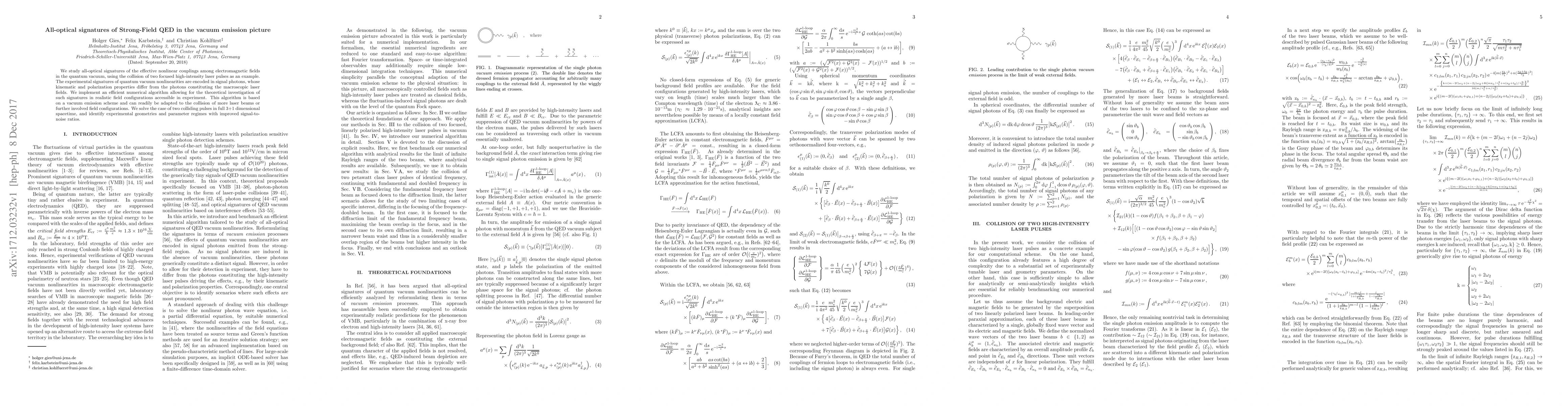 This paper investigates all-optical signatures of strong-field quantum electrodynamics (QED) in the vacuum emission of signal photons during the collision of high-intensity laser pulses. The study employs a numerical algorithm based on vacuum emission to identify the unique kinematic and polarization properties of these photons, aiming to improve experimental detection of quantum vacuum nonlinearities.