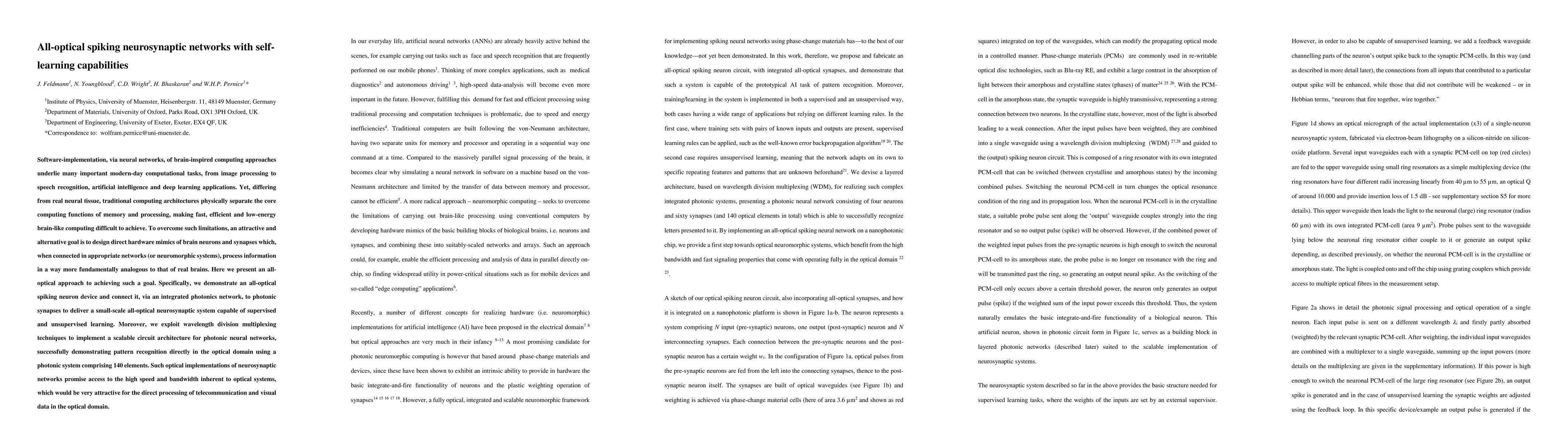 This paper presents an all-optical spiking neurosynaptic network using photonic neurons and synapses, enabling scalable, high-speed learning and pattern recognition. The system leverages integrated photonics and wavelength division multiplexing for efficient, low-energy brain-like computing.