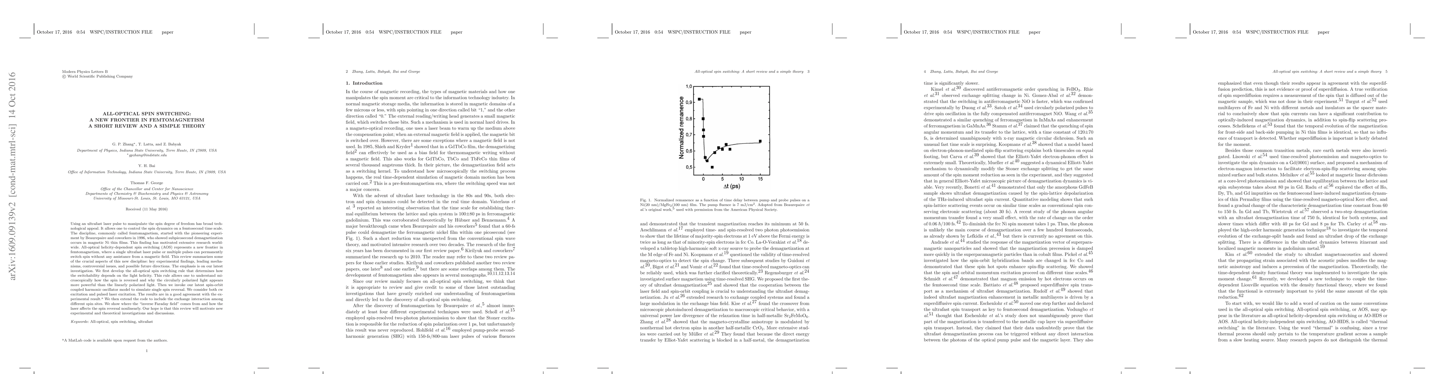 Using an ultrafast laser pulse to manipulate the spin degree of freedom has broad technological appeal. It allows one to control the spin dynamics on a femtosecond time scale. The discipline, commonly called femtomagnetism, started with the pioneering experiment by Beaurepaire and coworkers in 1996, who showed subpicosecond demagnetization occurs in magnetic Ni thin films. This finding has motivated extensive research worldwide. All-optical helicity-dependent spin switching (AOS) represents a new frontier in femtomagnetism, where a single ultrafast laser pulse can permanently switch spin without any assistance from a magnetic field. This review summarizes some of the crucial aspects of this new discipline: key experimental findings, leading mechanisms, controversial issues, and possible future directions. The emphasis is on our latest investigation. We first develop the all-optical spin switching rule that determines how the switchability depends on the light helicity. This rule allows one to understand microscopically how the spin is reversed and why the circularly polarized light appears more powerful than the linearly polarized light. Then we invoke our latest spin-orbit coupled harmonic oscillator model to simulate single spin reversal. We consider both cw excitation and pulsed laser excitation. The results are in a good agreement with the experimental result. We then extend the code to include the exchange interaction among different spin sites. We show where the "inverse Faraday field" comes from and how the laser affects the spin reversal nonlinearly. Our hope is that this review will motivate new experimental and theoretical investigations and discussions.