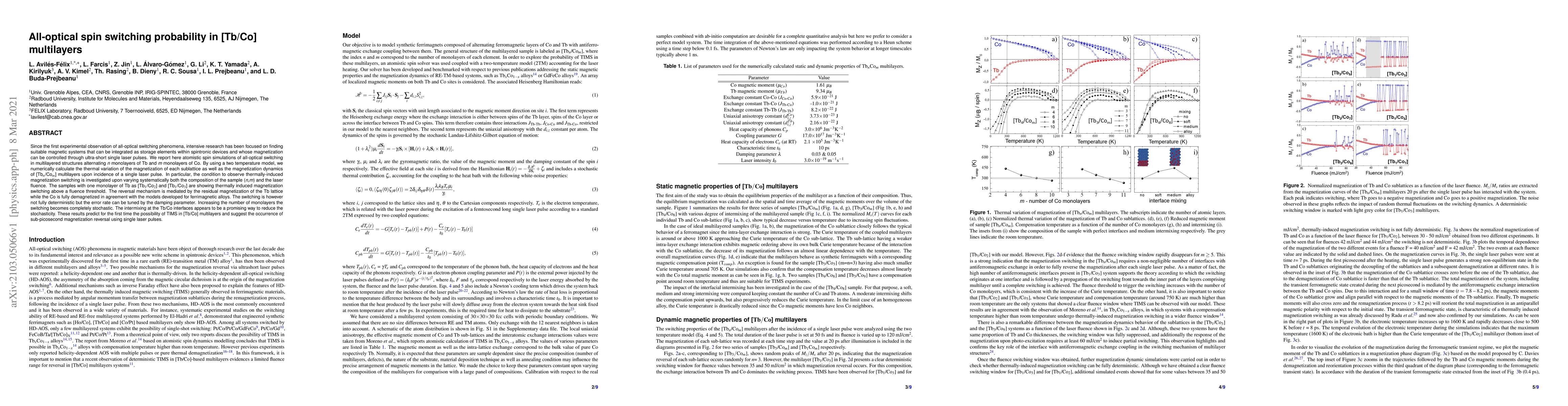 This paper reports on atomistic spin simulations of all-optical switching in [Tb/Co] multilayers using a two-temperature model, revealing the potential for thermally-induced magnetization switching above a fluence threshold. The study finds that while the switching is not fully deterministic, intermixing at Tb/Co interfaces may reduce stochasticity, suggesting sub-picosecond magnetization reversal using single laser pulses.