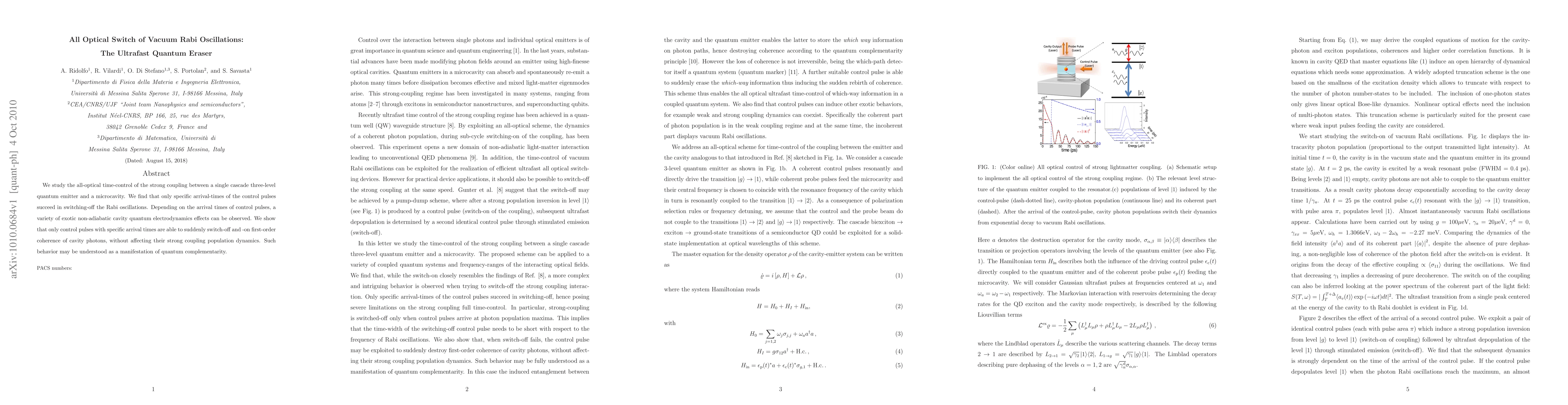 This paper explores the all-optical manipulation of vacuum Rabi oscillations in a microcavity-quantum emitter system, demonstrating that specific timing of control pulses can switch off Rabi oscillations and first-order coherence of cavity photons, revealing quantum complementarity effects.