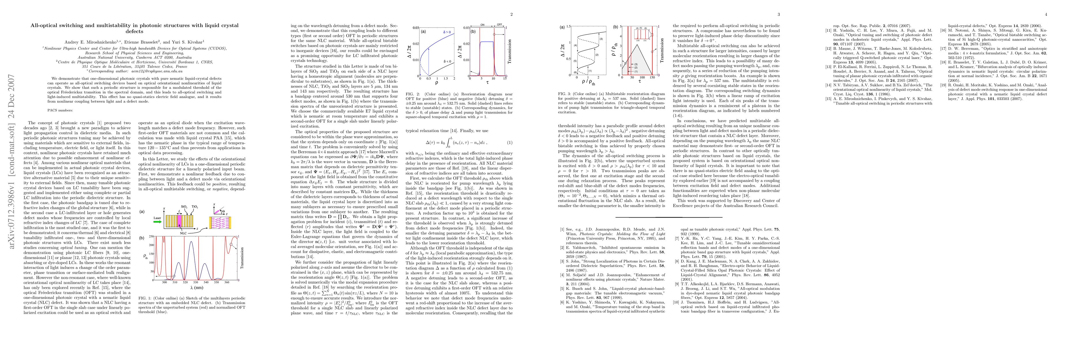 This paper demonstrates that one-dimensional photonic crystals with nematic liquid-crystal defects can function as all-optical switches due to the optical orientational nonlinearities of liquid crystals, leading to light-induced multistability without a quasi-static electric field analogue. The effect arises from nonlinear coupling between light and a defect mode.