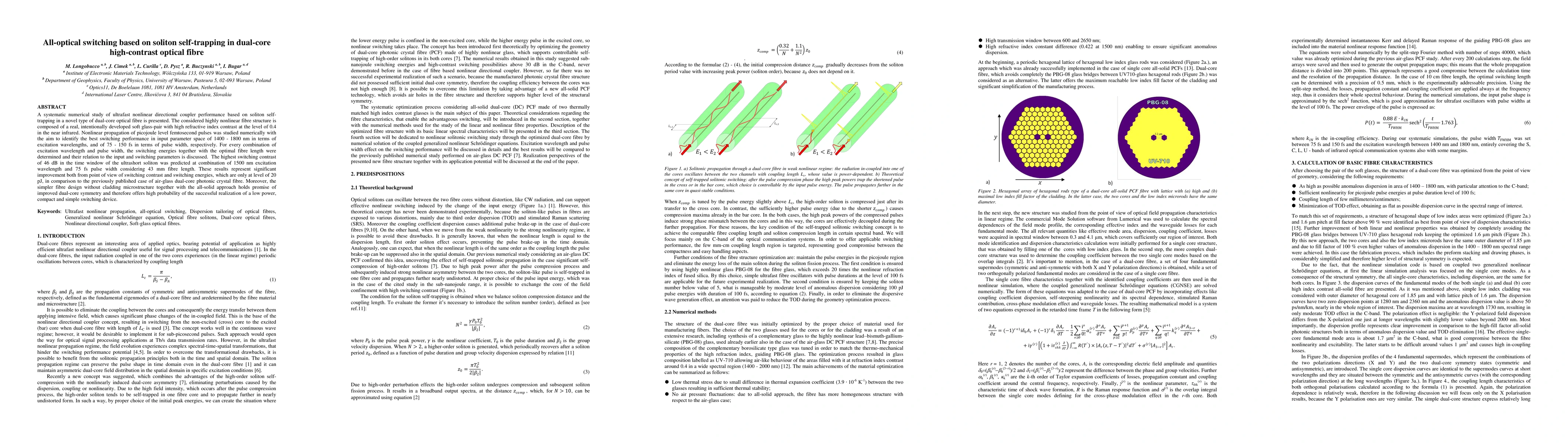This paper presents a numerical study on ultrafast all-optical switching based on soliton self-trapping in a novel dual-core high-contrast optical fibre. The study identifies optimal switching parameters achieving a high switching contrast of 46 dB with low switching energies of 20 pJ, demonstrating significant improvements over previous designs.