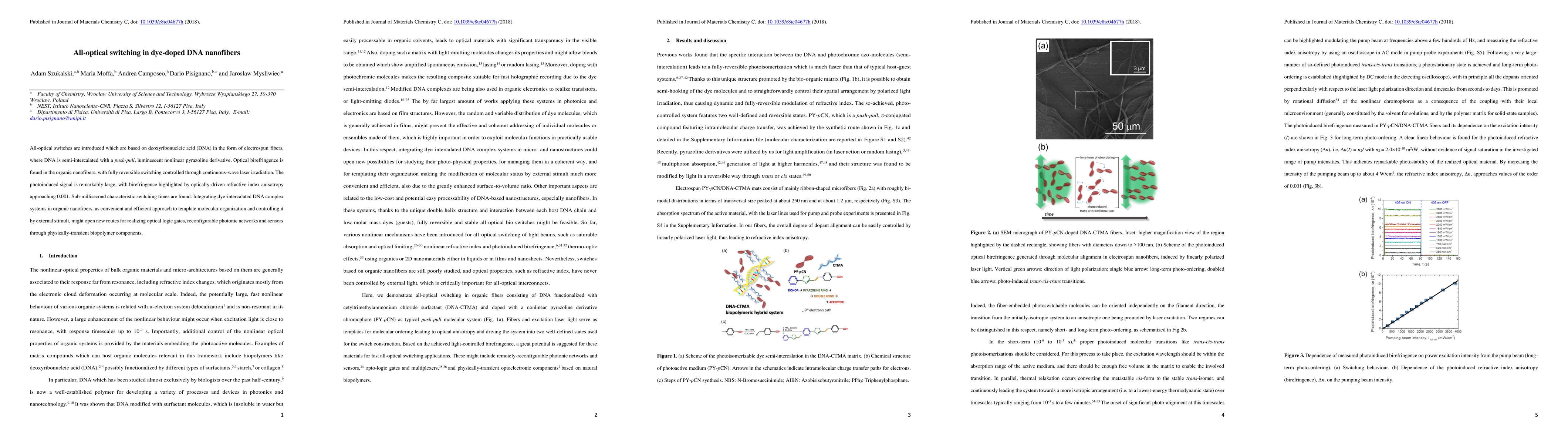 This paper introduces all-optical switches based on dye-doped DNA nanofibers with reversible switching controlled by continuous-wave laser irradiation, demonstrating large photoinduced birefringence and sub-millisecond switching times, potentially enabling optical logic gates and sensors.