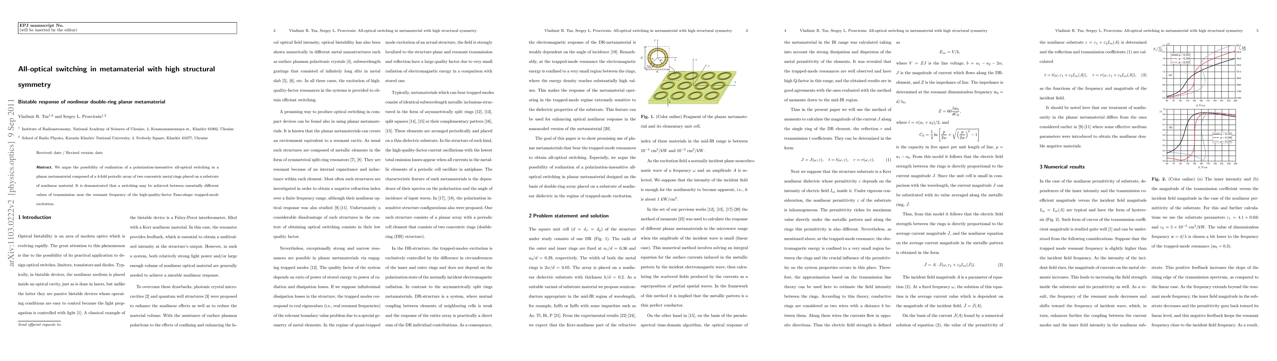 We argue the possibility of realization of a polarization insensitive all-optical switching in a planar metamaterial composed of a 4-fold periodic array of two concentric metal rings placed on a substrate of nonlinear material. It is demonstrated that a switching may be achieved between essentially different values of transmission near the resonant frequency of the high-quality-factor Fano-shape trapped-mode excitation.