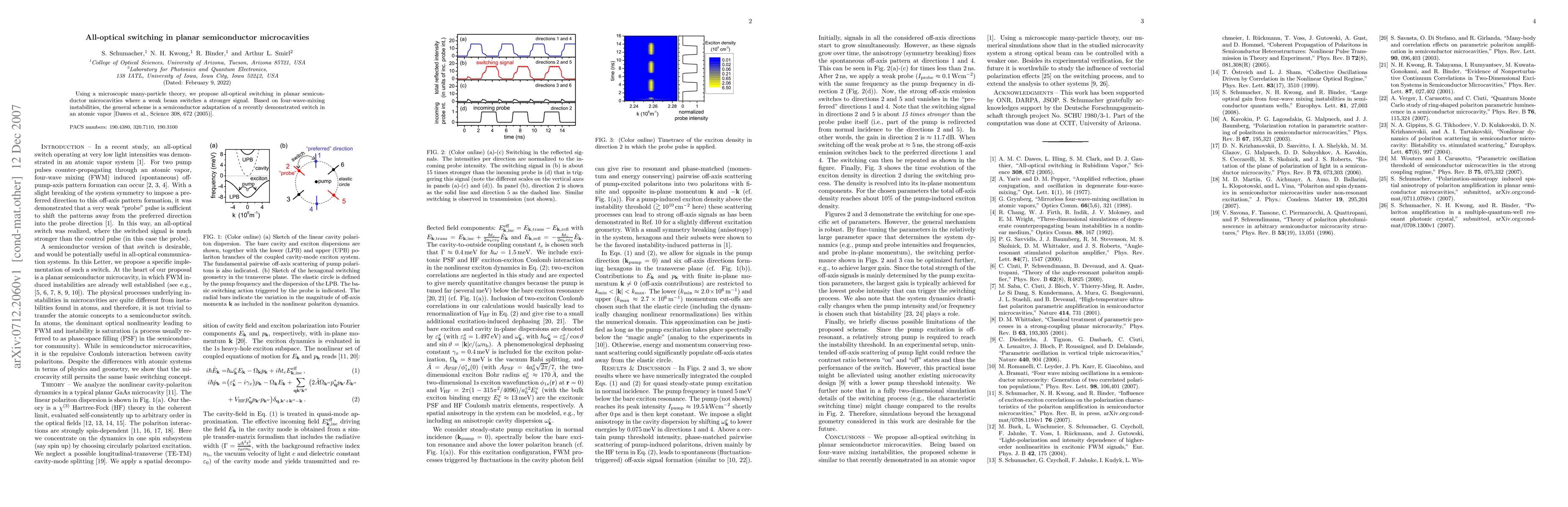The main technical contribution is a microscopic many-particle theory demonstrating that strong optical beams can be controlled by weaker ones in planar semiconductor microcavities based on four-wave mixing instabilities.