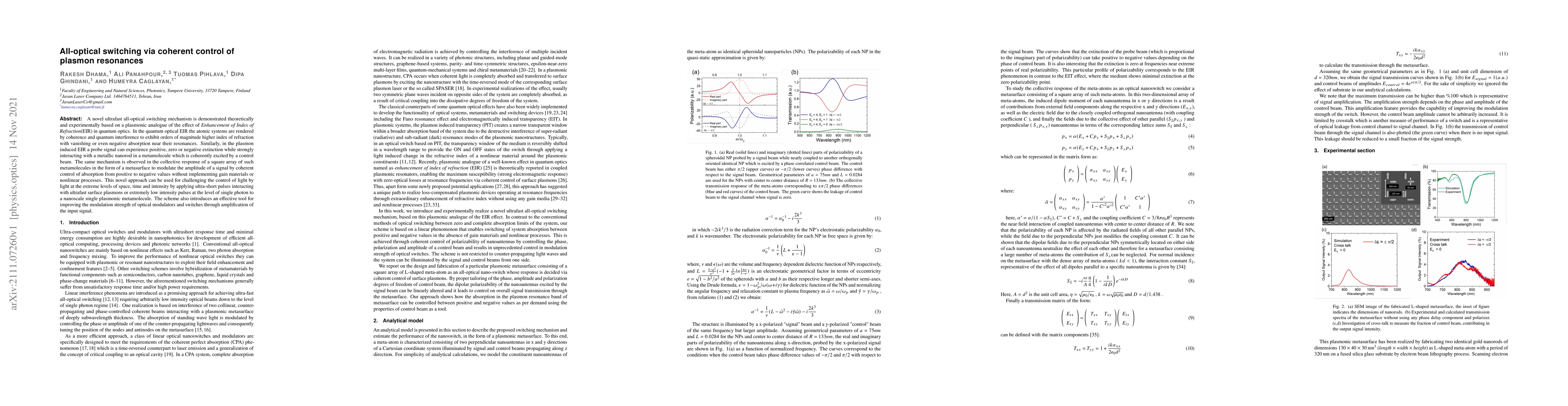 This paper demonstrates a novel ultrafast all-optical switching mechanism based on coherent control of plasmon resonances in metallic nanorods, achieving modulation without gain materials or nonlinear processes. The method enhances the index of refraction and can amplify input signals, potentially revolutionizing light control at nanoscale levels.