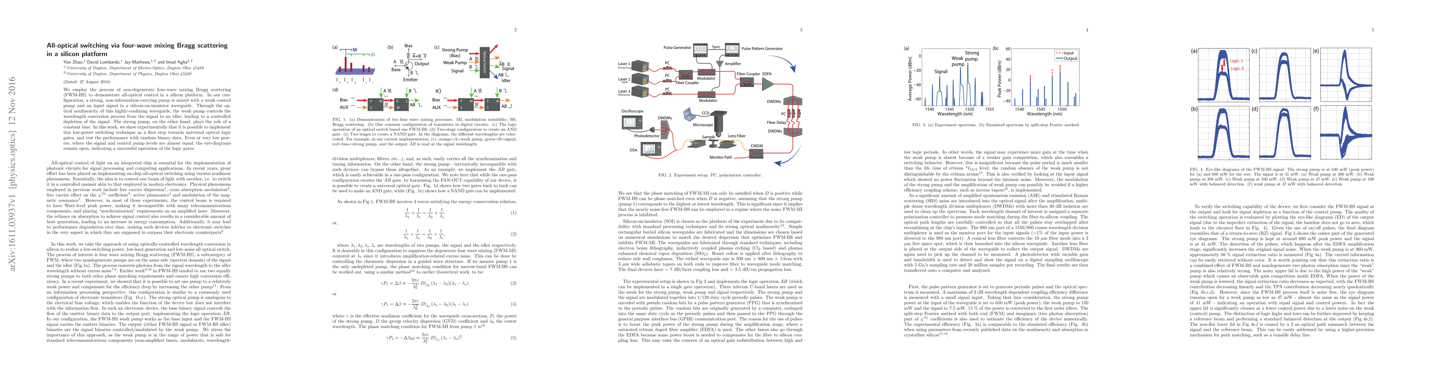 This paper demonstrates an all-optical switching technique using non-degenerate four-wave mixing Bragg scattering in silicon-on-insulator waveguides. The weak control pump modulates the conversion of an input signal to an idler, enabling low-power optical logic operations, as evidenced by clear eye-diagrams even at minimal pump power levels.