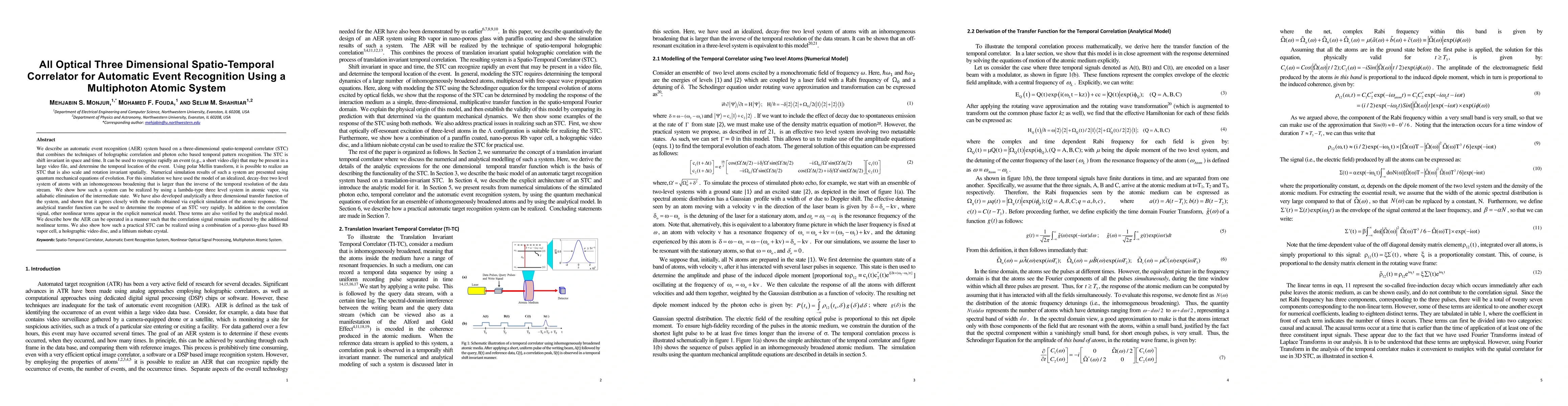 This paper presents an automatic event recognition system utilizing a three-dimensional spatio-temporal correlator based on multiphoton atomic systems. The system employs holographic correlation and photon echo techniques to recognize and locate events in large video files, demonstrating invariance to shift, scale, and rotation.