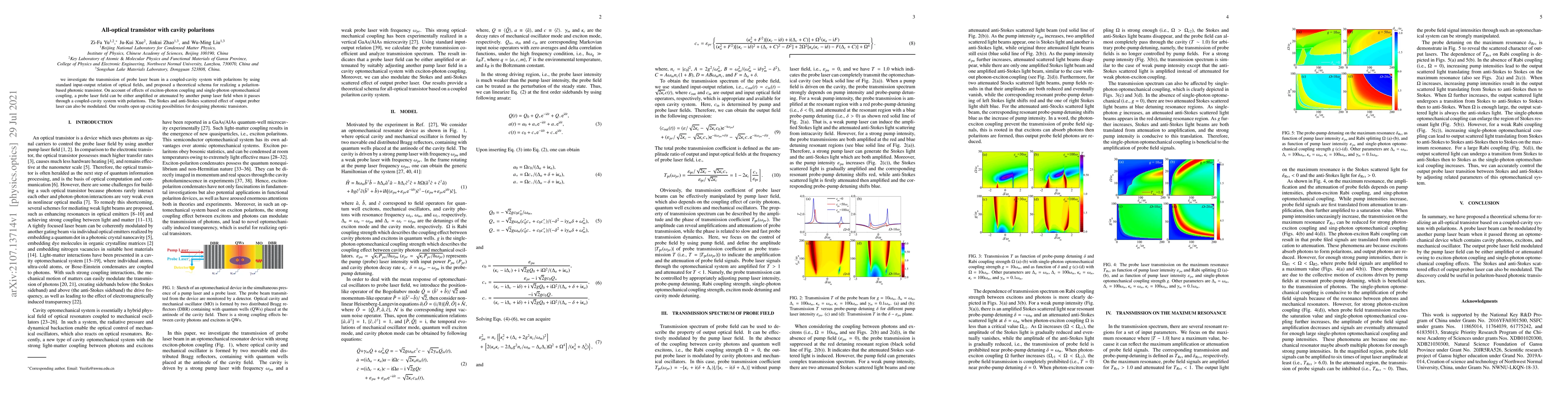 This paper explores the use of cavity polaritons in a coupled-cavity system to create an all-optical transistor, where a probe laser beam's transmission is modulated by a pump laser field, enabling amplification or attenuation. The study proposes a theoretical framework for such a polariton-based photonic transistor, highlighting potential for advanced photonic device design.