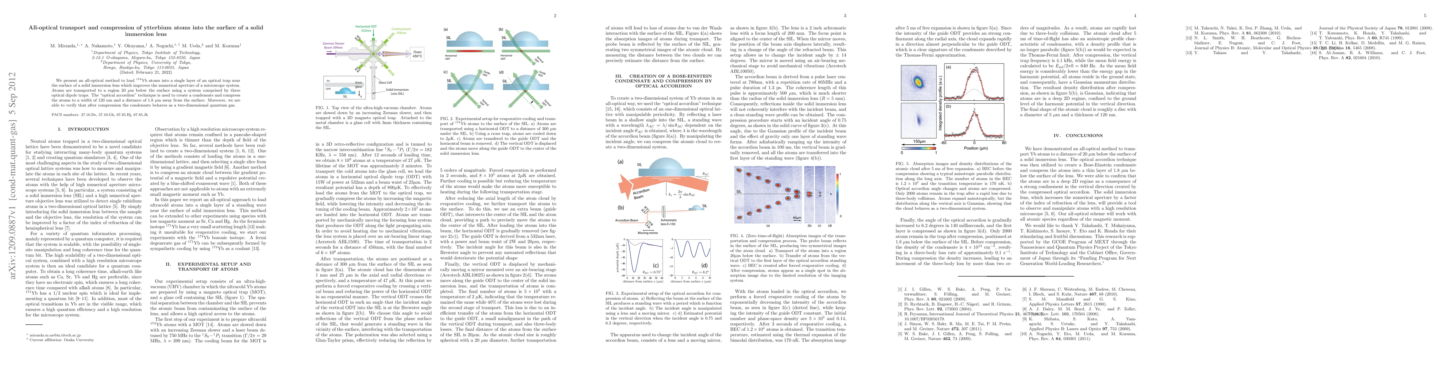 We present an all-optical method to load 174Yb atoms into a single layer of an optical trap near the surface of a solid immersion lens which improves the numerical aperture of a microscope system. Atoms are transported to a region 20 um below the surface using a system comprised by three optical dipole traps. The "optical accordion" technique is used to create a condensate and compress the atoms to a width of 120 nm and a distance of 1.8 um away from the surface. Moreover, we are able to verify that after compression the condensate behaves as a two-dimensional quantum gas.