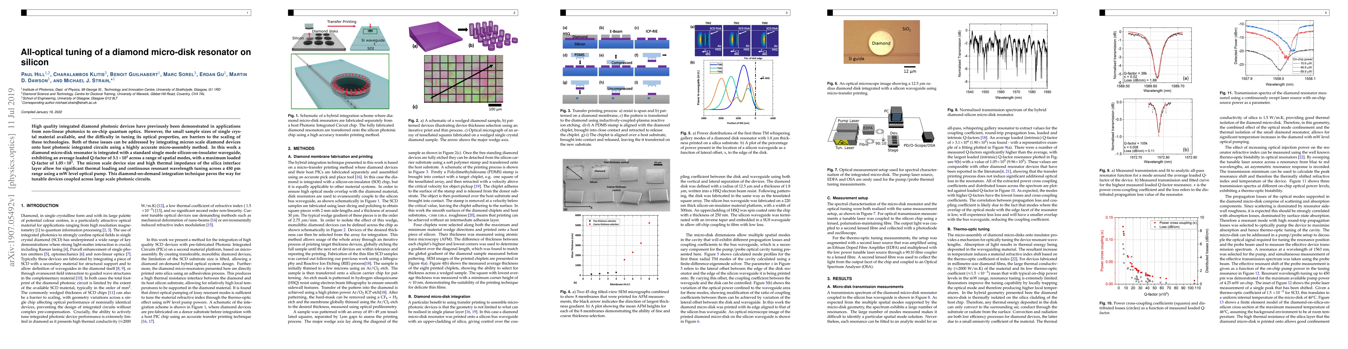 This paper demonstrates the integration of a diamond micro-disk resonator onto a silicon photonic circuit, achieving high Q-factors and enabling all-optical tuning across a 450 pm range, addressing scalability issues in diamond photonic devices.