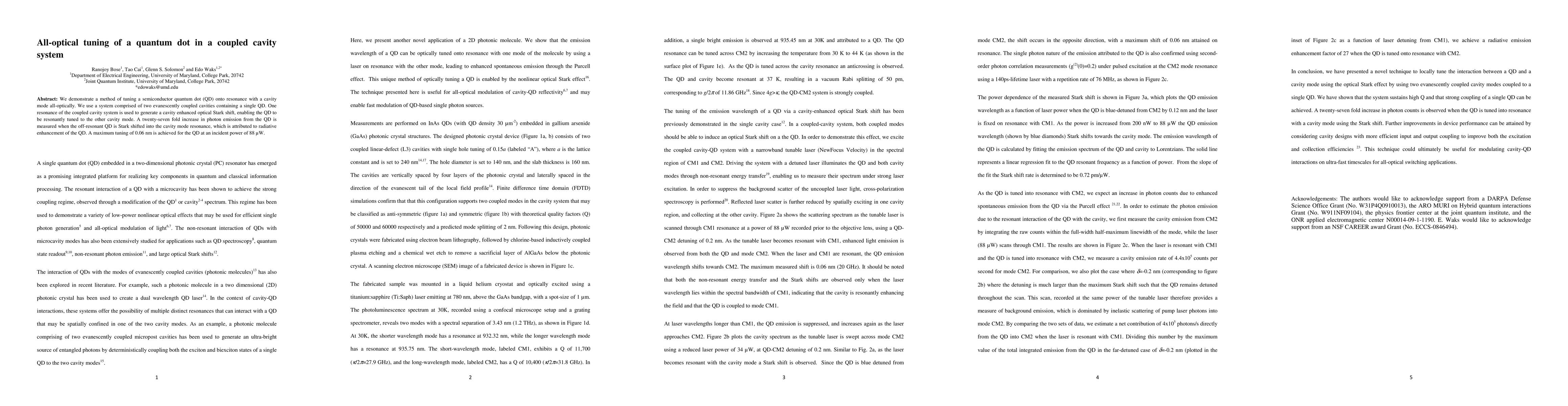 This paper presents an all-optical method for tuning a semiconductor quantum dot to resonance with a cavity mode in a coupled cavity system, achieving a 27-fold increase in photon emission and demonstrating a maximum tuning of 0.06 nm at an incident power of 88 μW.
