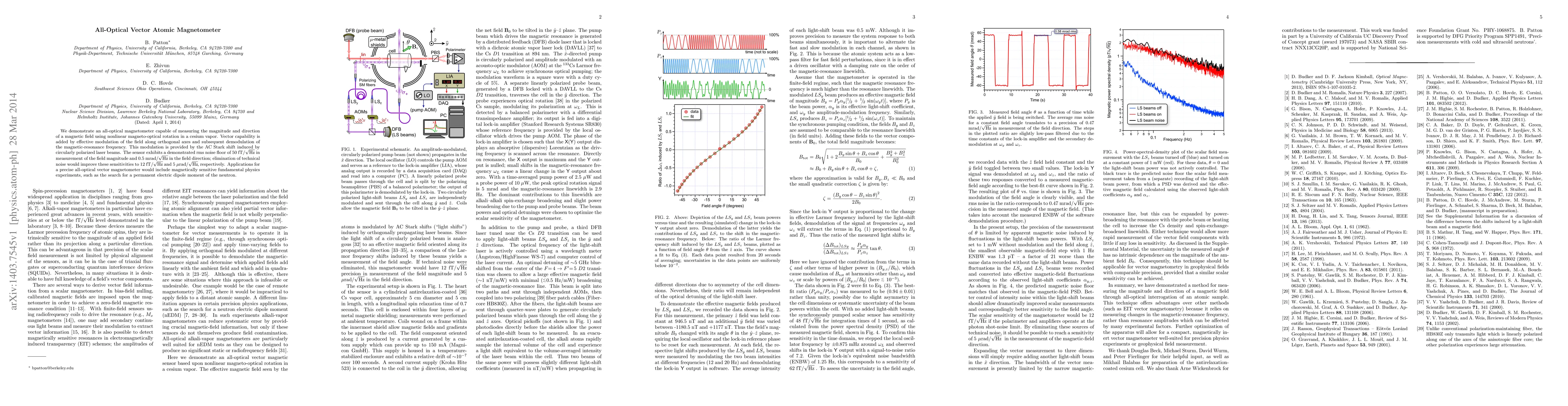 This paper presents an all-optical vector magnetometer utilizing nonlinear magneto-optical rotation in cesium vapor to measure magnetic field magnitude and direction with high sensitivity. The system achieves 50 fT/Hz^(1/2) noise for field magnitude and 0.5 mrad/Hz^(1/2) for direction, with potential for further improvements.