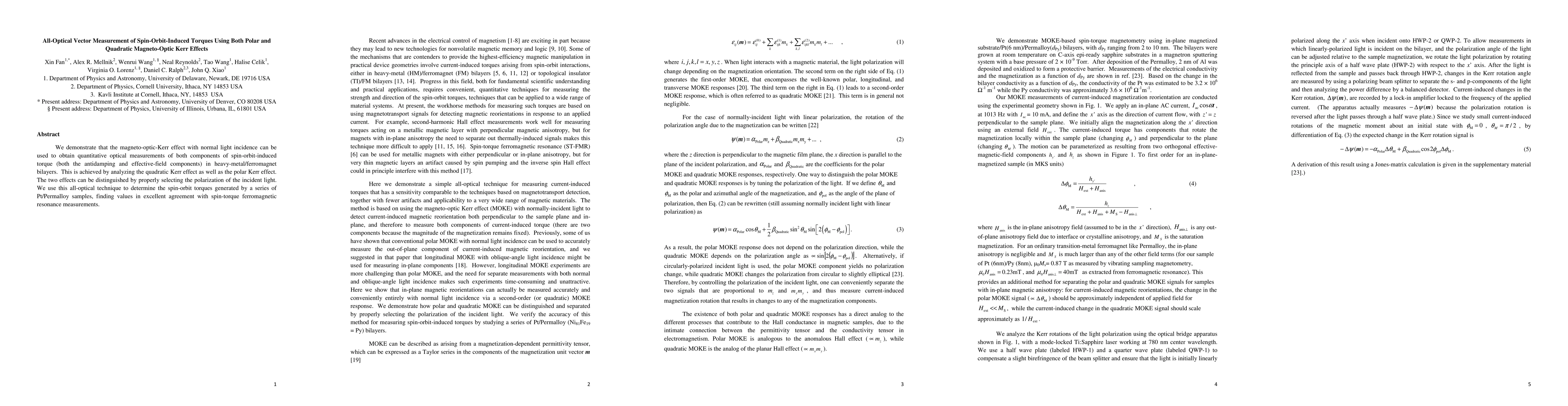 Researchers demonstrate an all-optical method to measure spin-orbit-induced torques using magneto-optic Kerr effects, achieving values in agreement with spin-torque ferromagnetic resonance measurements.