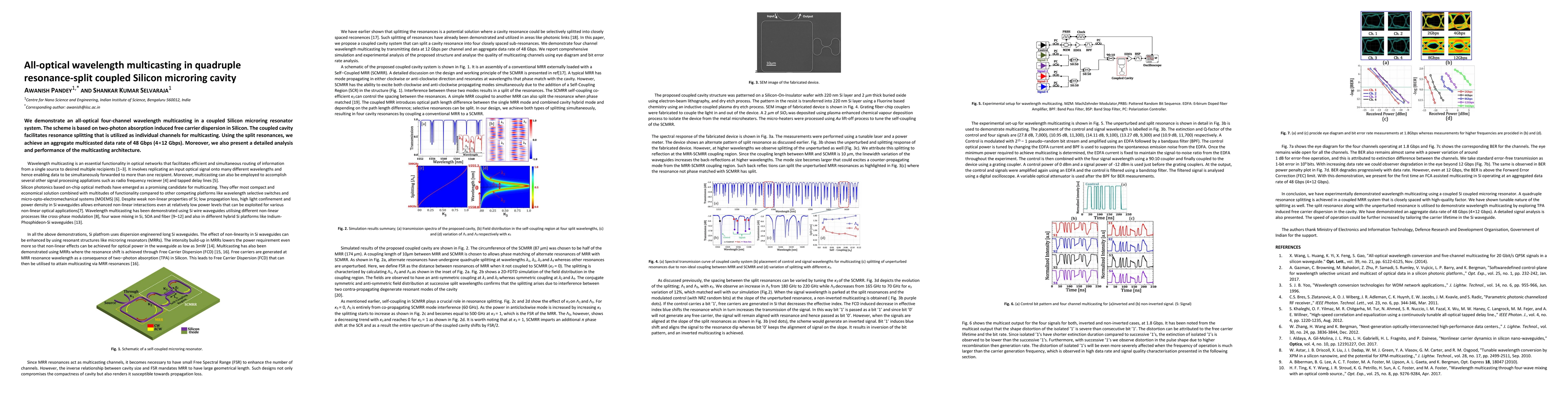 We demonstrate an all-optical four-channel wavelength multicasting in a coupled Silicon microring resonator system. The scheme is based on two-photon absorption induced free carrier dispersion in Silicon. The coupled cavity facilitates resonance splitting that is utilized as individual channels for multicasting. Using the split resonances, we achieve an aggregate multicasted data rate of 48 Gbps (4X12 Gbps). Moreover, we also present a detailed analysis and performance of the multicasting architecture.