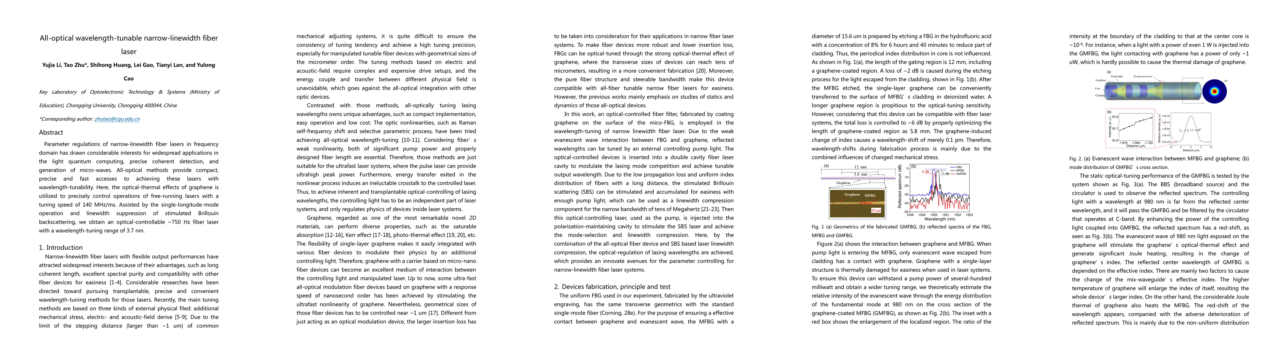 This paper presents a compact all-optical method for tuning the wavelength of narrow-linewidth fiber lasers using graphene's optical-thermal effects, achieving a tuning speed of 140 MHz/ms. The technique enables precise control over a 3.7 nm wavelength range, resulting in a ~750 Hz linewidth fiber laser suitable for quantum computing and microwave generation.