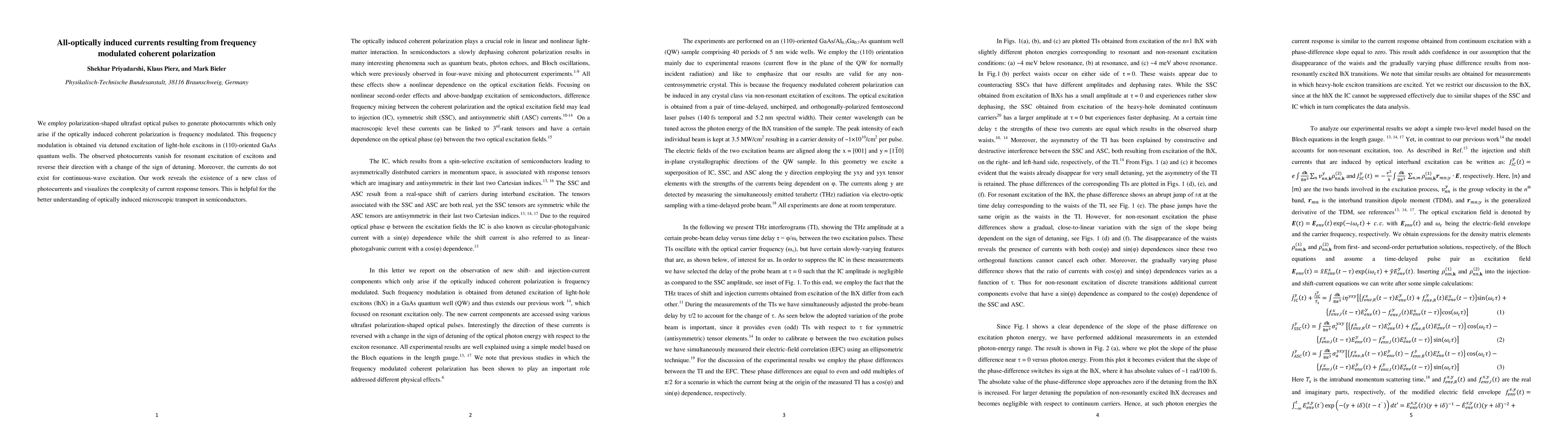 This paper investigates the generation of all-optically induced currents through frequency-modulated coherent polarization using ultrafast optical pulses in GaAs quantum wells. The study finds that these photocurrents only occur with detuned excitation of light-hole excitons, revealing a new class of photocurrents and enhancing the understanding of microscopic transport in semiconductors.