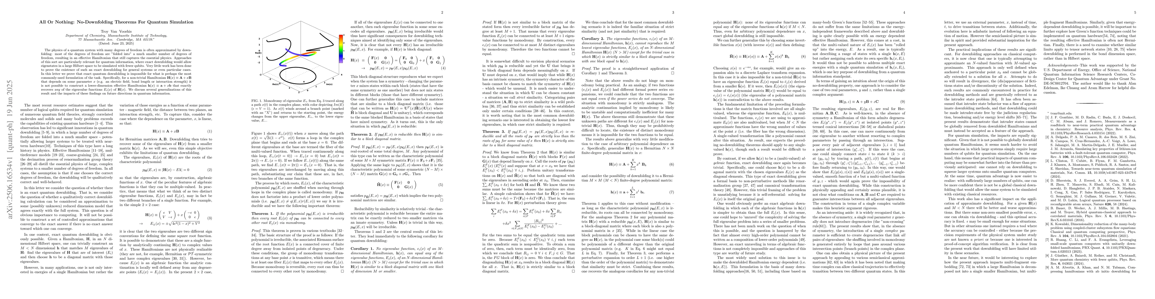 The physics of a quantum system with many degrees of freedom is often approximated by downfolding: most of the degrees of freedom are "folded into" a much smaller number of degrees of freedom, resulting in an effective Hamiltonian that still captures the essential physics. Approaches of this sort are particularly relevant for quantum information, where exact downfolding would allow eigenstates in a large Hilbert space to be simulated with fewer qubits. Very little work has been done to prove the existence of such an exact downfolding for general systems or even particular cases. In this letter we prove that exact quantum downfolding is impossible for what is perhaps the most commonly-used formulation of the task. Specifically, for a non-trivial Hamiltonian $\mathbf{H}(x)\equiv\mathbf{A}+x\mathbf{B}$ that depends on some parameter $x$ (e.g. an electric field, bond length or interaction strength) it is not possible to construct a lower-dimension effective Hamiltonian $\mathbf{h}(x)\equiv\mathbf{a}+x\mathbf{b}$ that exactly recovers \emph{any} of the eigenvalue functions $E_i(x)$ of $\mathbf{H}(x)$. We discuss several generalizations of this result and the impacts of these findings on future directions in quantum information.