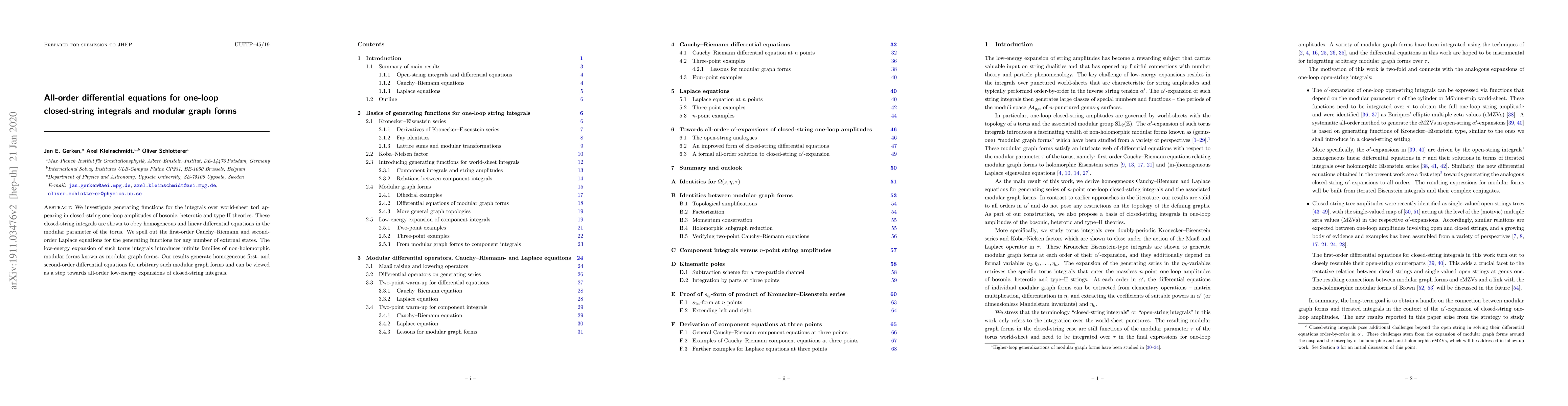 This paper explores generating functions for one-loop closed-string integrals in bosonic, heterotic, and type-II theories, demonstrating they satisfy differential equations in the torus's modular parameter. It introduces first-order Cauchy-Riemann and second-order Laplace equations for these integrals and identifies infinite families of modular graph forms from their low-energy expansions.