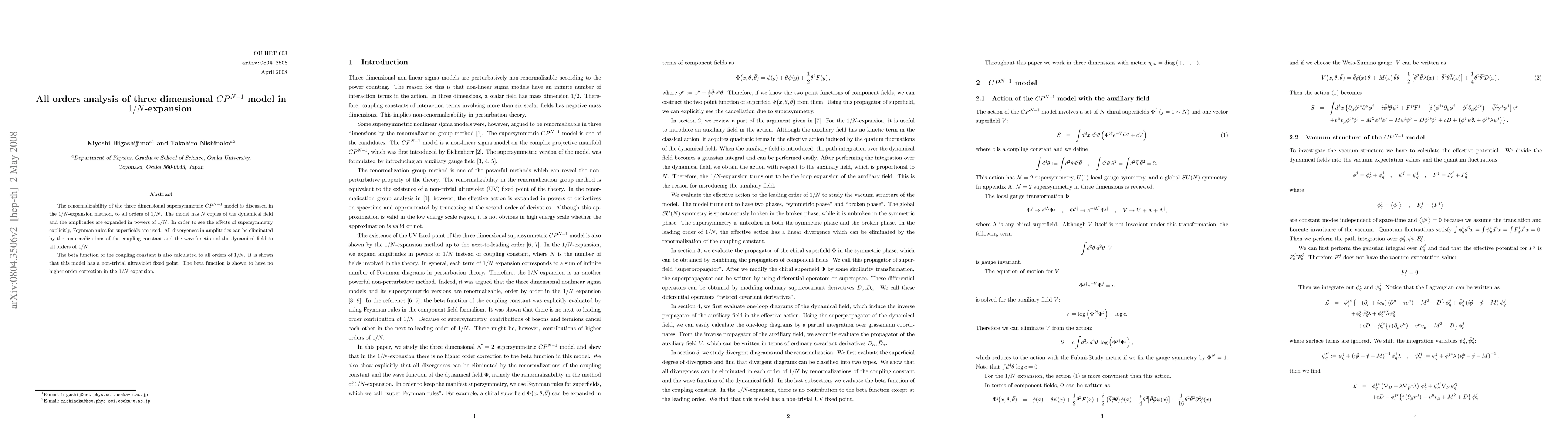 This paper analyzes the renormalizability of the three-dimensional supersymmetric CP^(N-1) model using the 1/N-expansion method to all orders, demonstrating that all divergences can be eliminated through renormalization. It reveals a non-trivial ultraviolet fixed point and confirms that the beta function has no higher-order corrections in the 1/N-expansion.