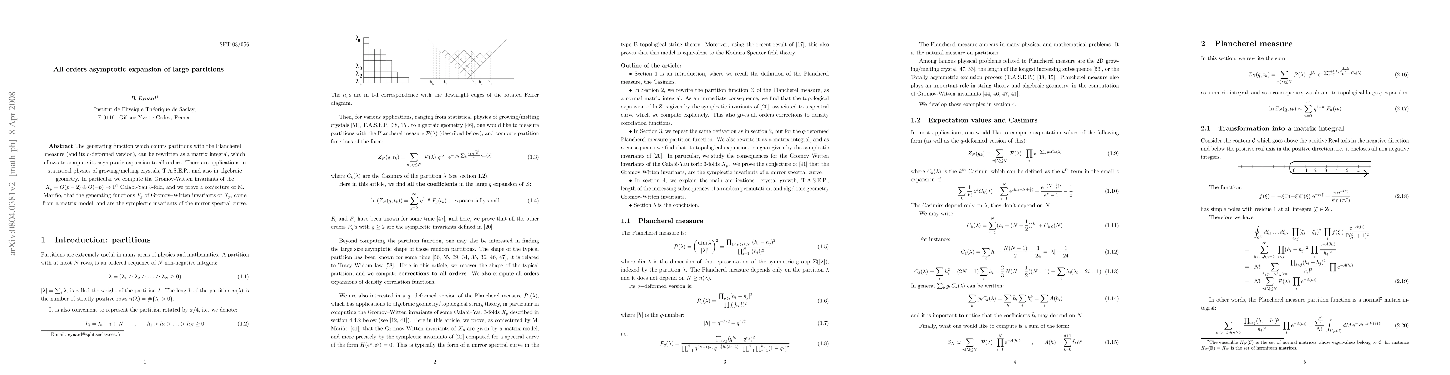 This paper derives the all-order asymptotic expansion of large partition functions using matrix integrals, with applications in statistical physics and algebraic geometry, including the computation of Gromov-Witten invariants for X_p Calabi-Yau 3-folds and proving a conjecture linking these to mirror spectral curves.