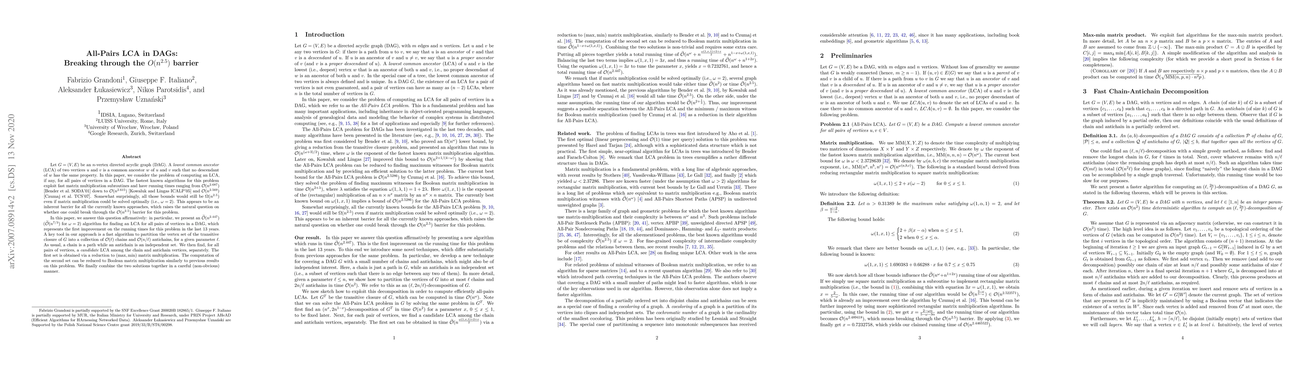The paper presents an algorithm for computing the Lowest Common Ancestor (LCA) for all pairs of vertices in a Directed Acyclic Graph (DAG), improving upon previous bounds by breaking the O(n^2.5) barrier with an algorithm running in O(n^(7/3)) time under the assumption that matrix multiplication can be solved optimally.