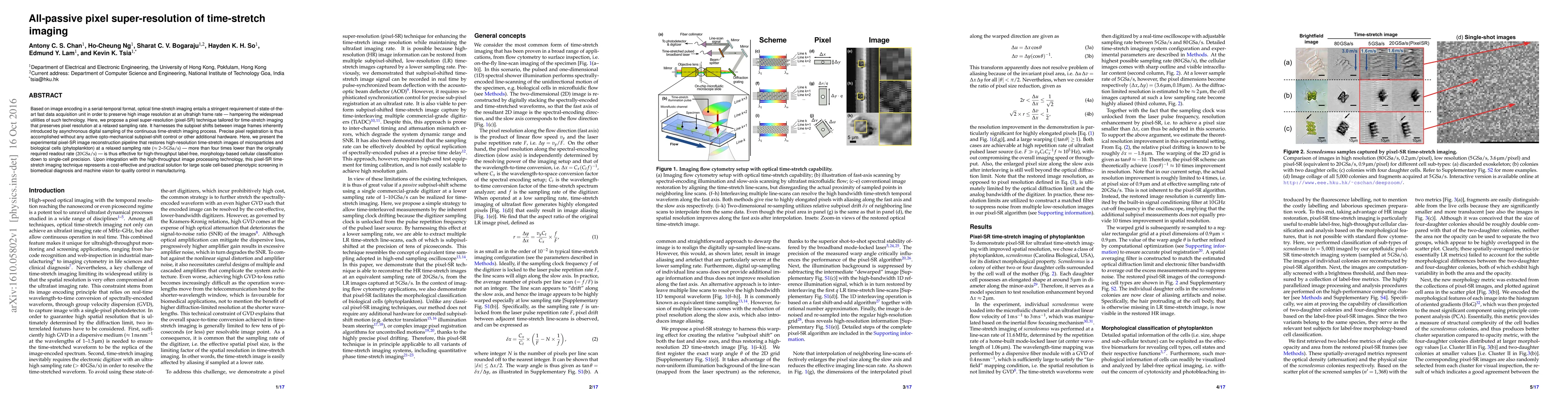 This paper proposes an all-passive pixel super-resolution technique for time-stretch imaging, enabling high-resolution image reconstruction at a significantly reduced sampling rate. The method leverages subpixel shifts from asynchronous digital sampling to achieve precise pixel registration without additional hardware, facilitating high-throughput cellular classification and large-scale biomedical screening.