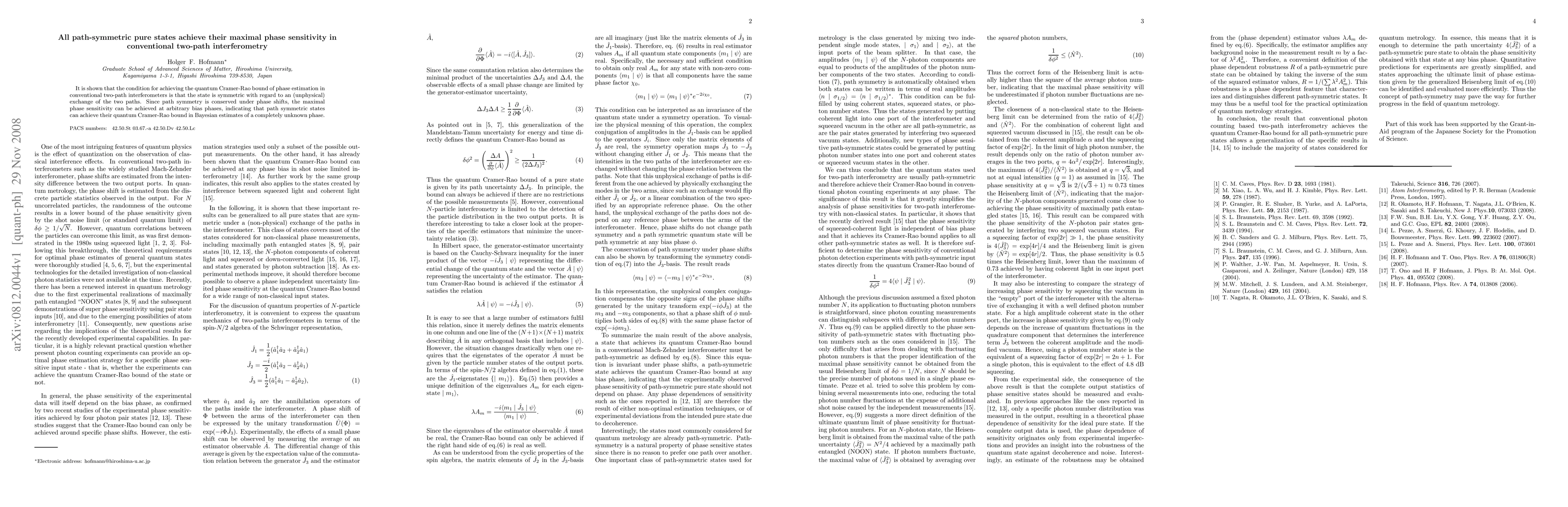 This paper demonstrates that all path-symmetric pure states can achieve the quantum Cramer-Rao bound for phase estimation in two-path interferometers, regardless of the bias phase, due to the conservation of path symmetry under phase shifts.