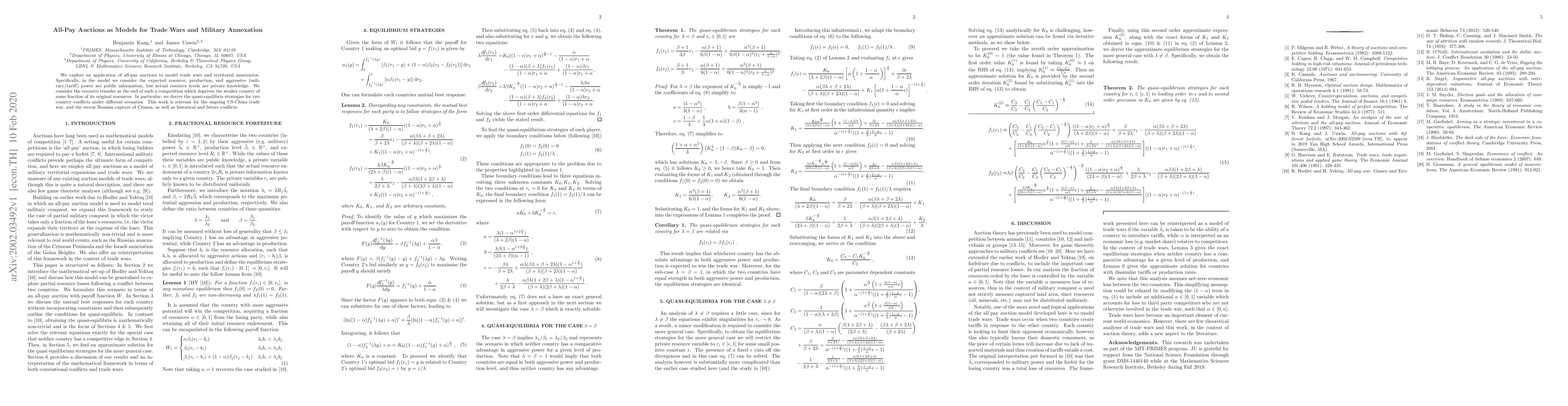 This paper applies all-pay auction theory to model trade wars and territorial annexation, deriving quasi-equilibrium strategies for two-country conflicts where resource levels are private information. The findings are relevant to current and historical conflicts, such as the US-China trade war and the Russian annexation of Crimea.
