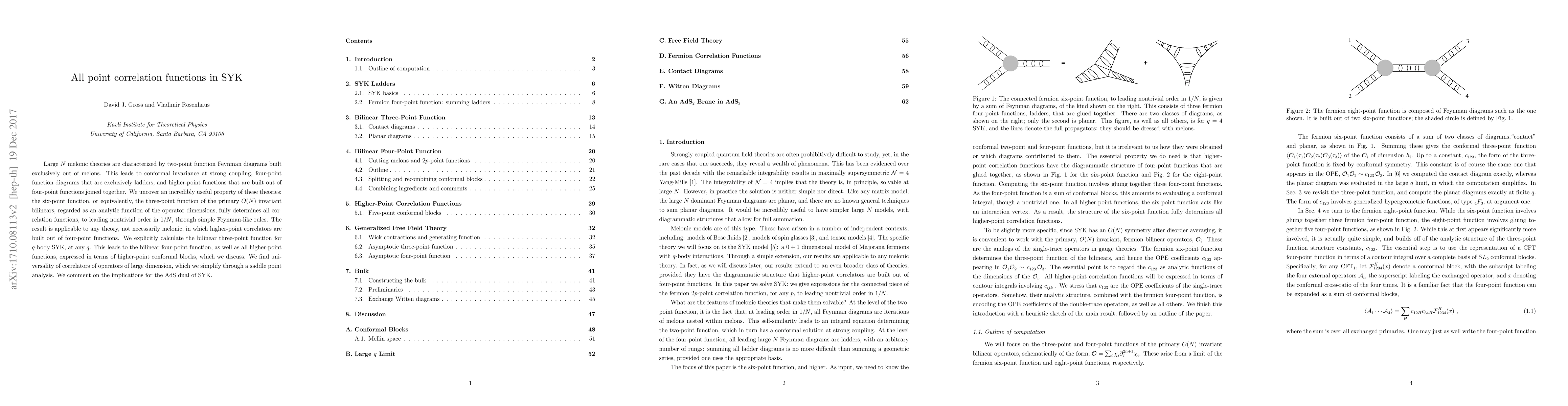 Large $N$ melonic theories are characterized by two-point function Feynman diagrams built exclusively out of melons. This leads to conformal invariance at strong coupling, four-point function diagrams that are exclusively ladders, and higher-point functions that are built out of four-point functions joined together. We uncover an incredibly useful property of these theories: the six-point function, or equivalently, the three-point function of the primary $O(N)$ invariant bilinears, regarded as an analytic function of the operator dimensions, fully determines all correlation functions, to leading nontrivial order in $1/N$, through simple Feynman-like rules. The result is applicable to any theory, not necessarily melonic, in which higher-point correlators are built out of four-point functions. We explicitly calculate the bilinear three-point function for $q$-body SYK, at any $q$. This leads to the bilinear four-point function, as well as all higher-point functions, expressed in terms of higher-point conformal blocks, which we discuss. We find universality of correlators of operators of large dimension, which we simplify through a saddle point analysis. We comment on the implications for the AdS dual of SYK.