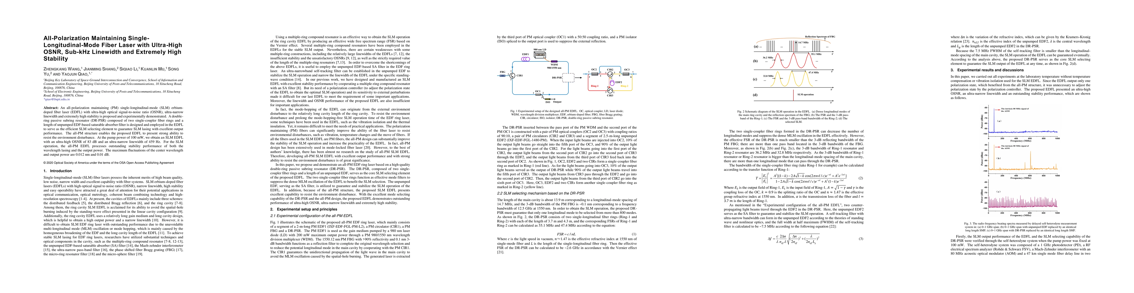 This paper proposes an all-polarization maintaining erbium-doped fiber laser (EDFL) with ultra-high optical signal-to-noise ratio, sub-kHz linewidth, and high stability, achieved using a double-ring passive subring resonator. The design demonstrates an ultra-high OSNR of 83 dB and an ultra-narrow linewidth of 459 Hz, with exceptional stability in both wavelength and output power.