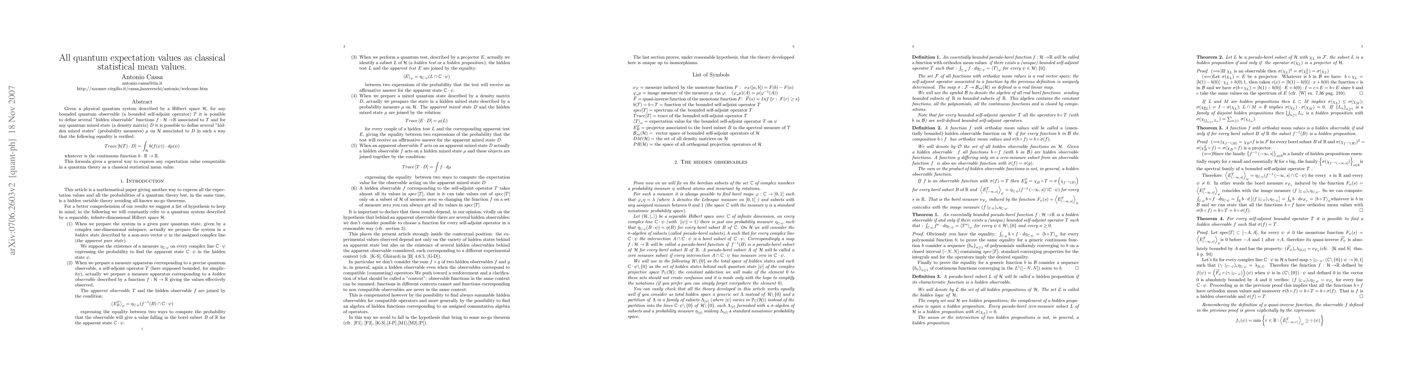 Given a physical quantum system described by a Hilbert H, for any bounded quantum observable (a bounded self-adjoint operator) T it is possible to define several ''hidden observable'' functions f:H->R associated to T and for any quantum mixed state (a density matrix) D it is possible to define several ''hidden mixed states'' (probability measures) m on H associated to D in such a way that the following equality is verified: Trace[ b(T). D] =integral[b(f(psi)).dm(psi) whatever is the continuous function b:R->R. This formula gives a general way to express any expectation value computable in a quantum theory as a classical statistical mean value.