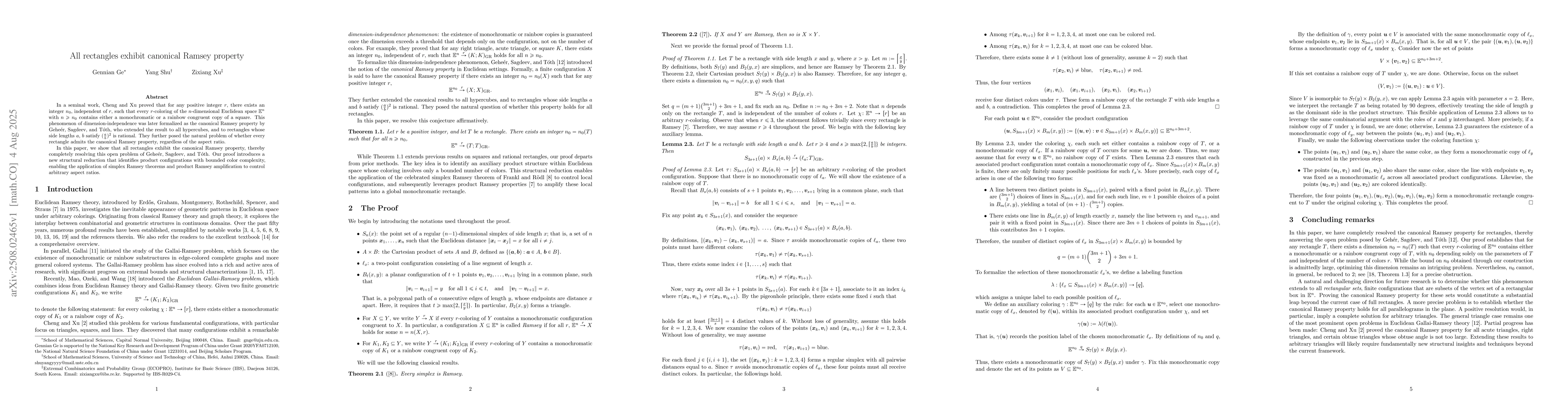 In a seminal work, Cheng and Xu proved that for any positive integer \(r\), there exists an integer \(n_0\), independent of \(r\), such that every \(r\)-coloring of the \(n\)-dimensional Euclidean space \(\mathbb{E}^n\) with \(n \ge n_0\) contains either a monochromatic or a rainbow congruent copy of a square. This phenomenon of dimension-independence was later formalized as the canonical Ramsey property by Gehe\'{e}r, Sagdeev, and T\'{o}th, who extended the result to all hypercubes, and to rectangles whose side lengths \(a\), \(b\) satisfy \((\frac{a}{b})^2\) is rational. They further posed the natural problem of whether every rectangle admits the canonical Ramsey property, regardless of the aspect ratio. In this paper, we show that all rectangles exhibit the canonical Ramsey property, thereby completely resolving this open problem of Gehe\'{e}r, Sagdeev, and T\'{o}th. Our proof introduces a new structural reduction that identifies product configurations with bounded color complexity, enabling the application of simplex Ramsey theorems and product Ramsey amplification to control arbitrary aspect ratios.