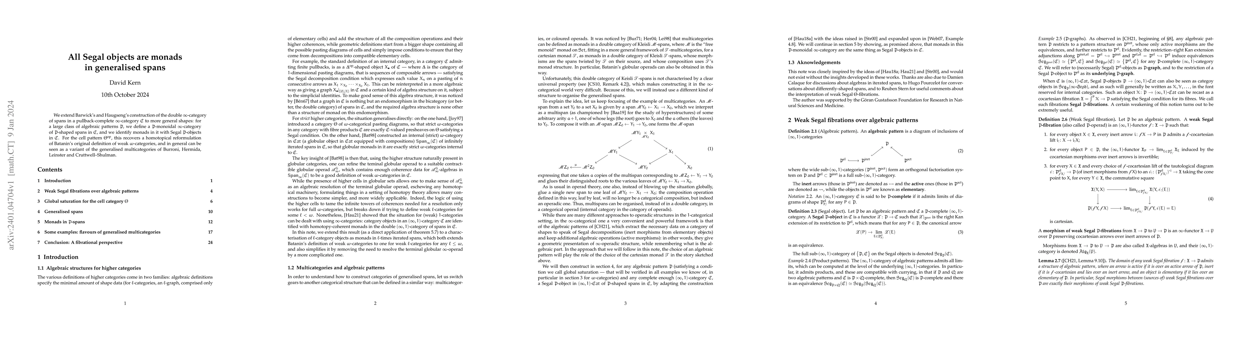 This paper extends the construction of $\infty$-categories of spans to more general algebraic patterns, showing that Segal objects correspond to monads in these categories. It recovers a homotopical reformulation of weak $\omega$-categories and aligns with generalised multicategories.