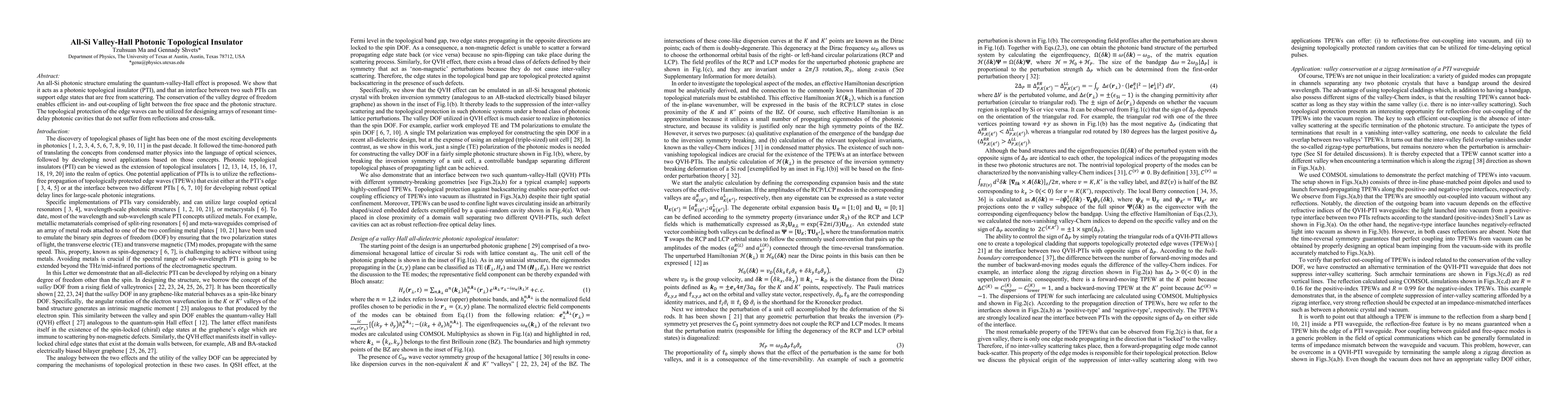 An all-silicon photonic structure demonstrates the quantum-valley-Hall effect, functioning as a photonic topological insulator (PTI) with edge states immune to scattering. This topological protection allows for efficient light coupling and can enable the design of resonant time-delay cavities free from reflections and cross-talk.