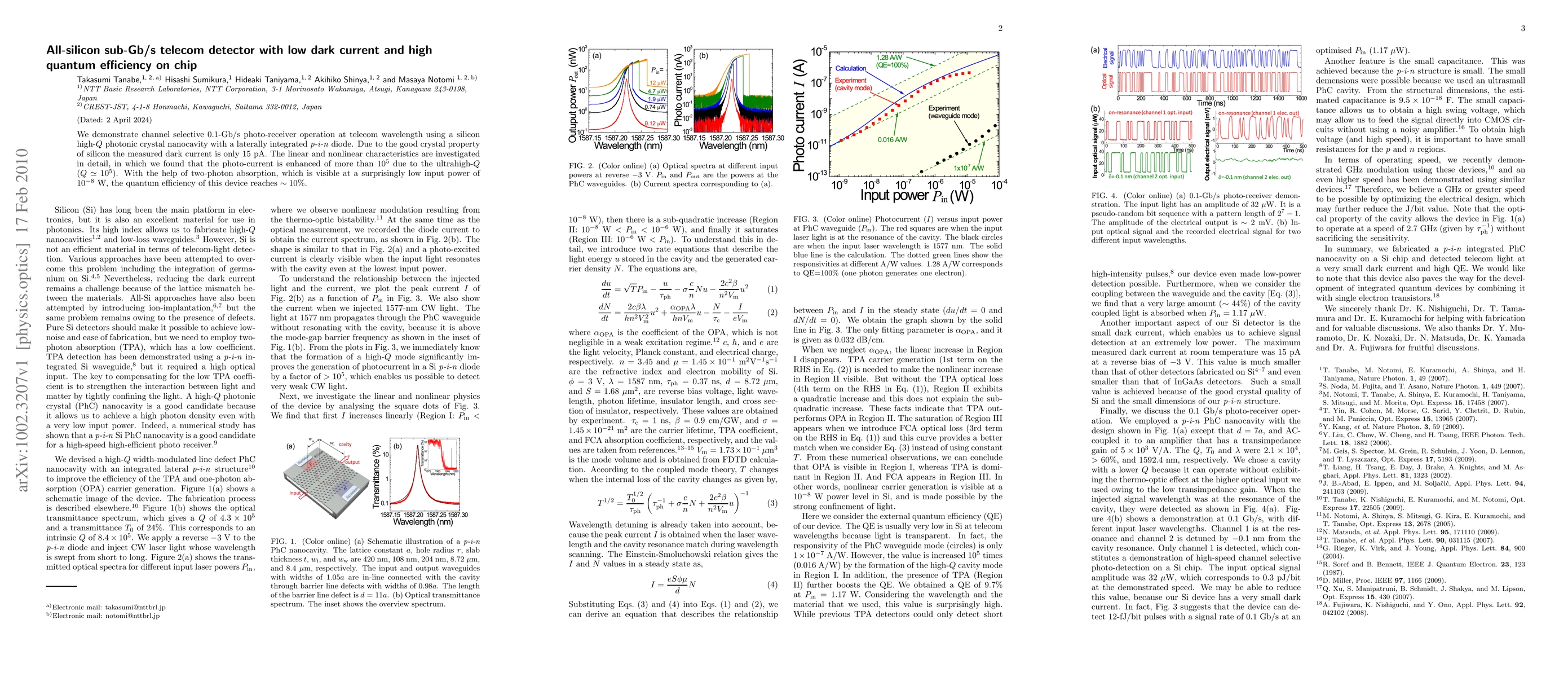 This paper presents a silicon-based telecom photo-receiver operating at 0.1 Gb/s, featuring a photonic crystal nanocavity with a laterally integrated p-i-n diode, achieving low dark current of 15 pA and high quantum efficiency of 10% due to two-photon absorption. The device's high-Q factor enhances the photo-current by over 100,000.