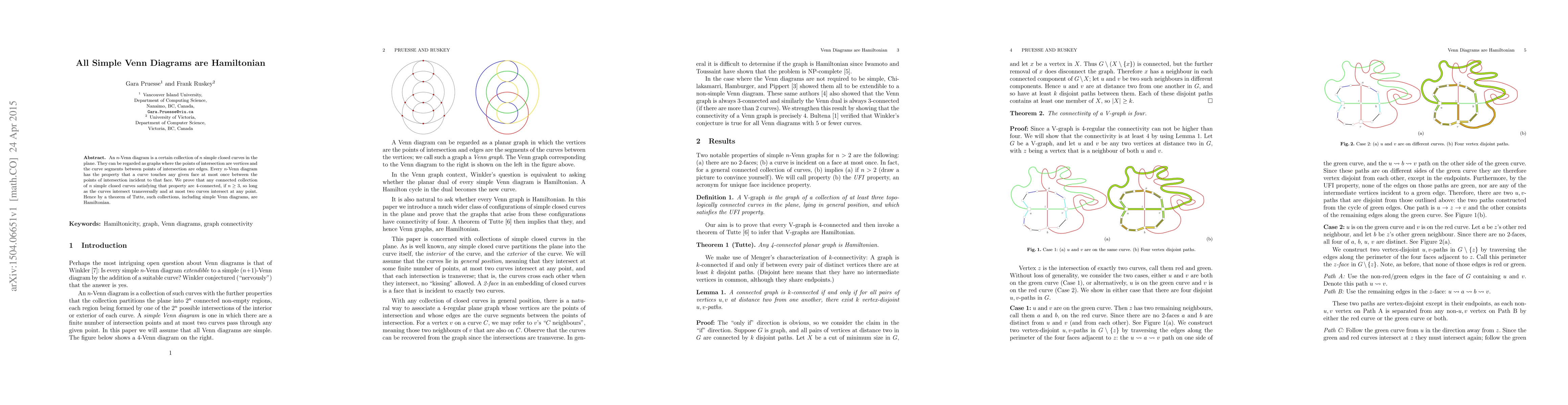 This paper proves that all simple Venn diagrams, which are collections of $n$ simple closed curves intersecting transversally and at most two curves meeting at any point, are Hamiltonian due to their 4-connectivity for $n \geq 3$. The conclusion leverages Tutte's theorem on Hamiltonian paths.